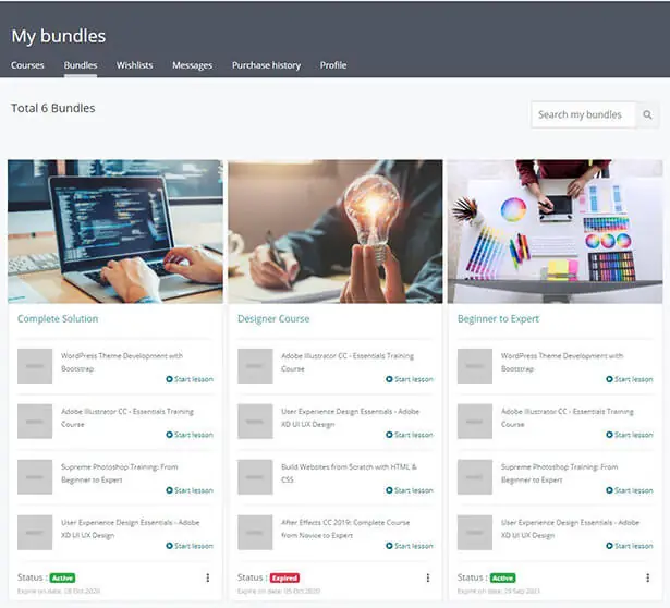 Students can access the purchased bundles from the “Bundles” option of the “My Courses” menu. The purchased bundles which have subscription validity left will show Active and those with validity period crossed will show Expired