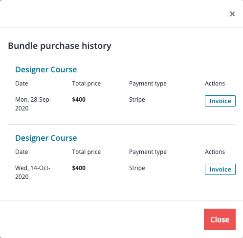The bundle subscriber can view the payment report which consists of all the invoices for the specific bundle purchased by the student. Students can view details and also can print the invoices generated in Purchase history
