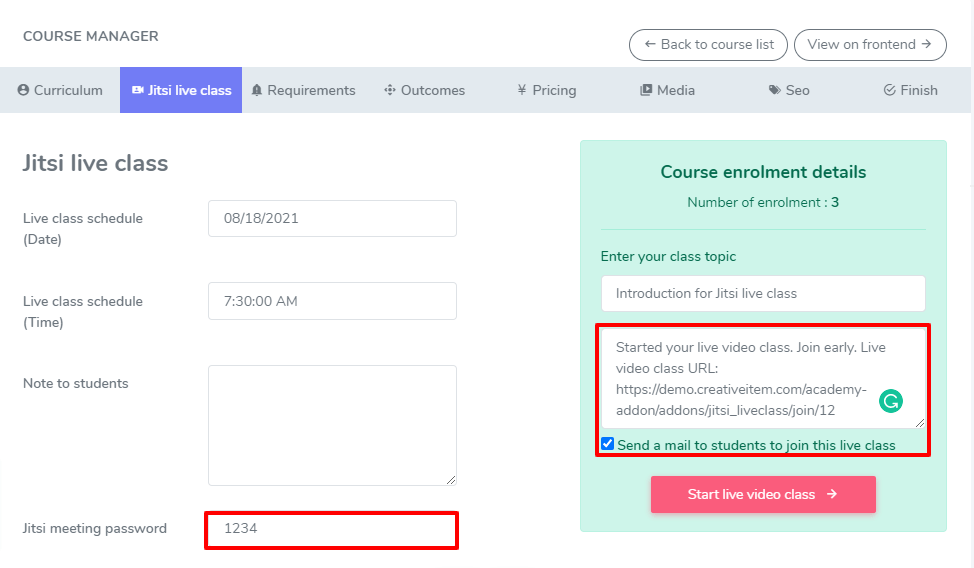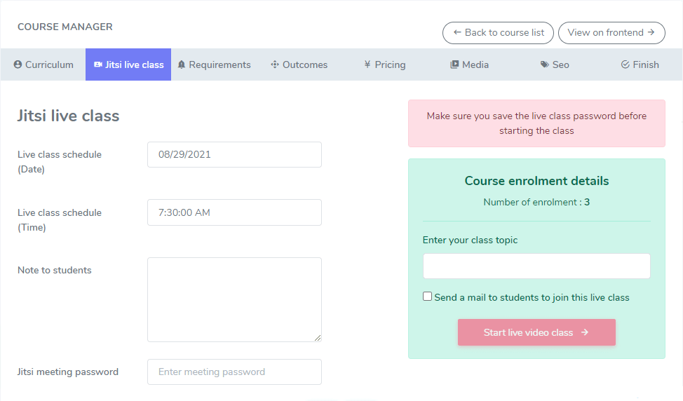 This live streaming addon for academy LMS is extremely secured. jitsi meeting’s valid url and password can’t be accessed by any outsider. Only valid and enrolled students are able to join in the live class with the course instructors. So, no worries about unauthorized access during streaming.