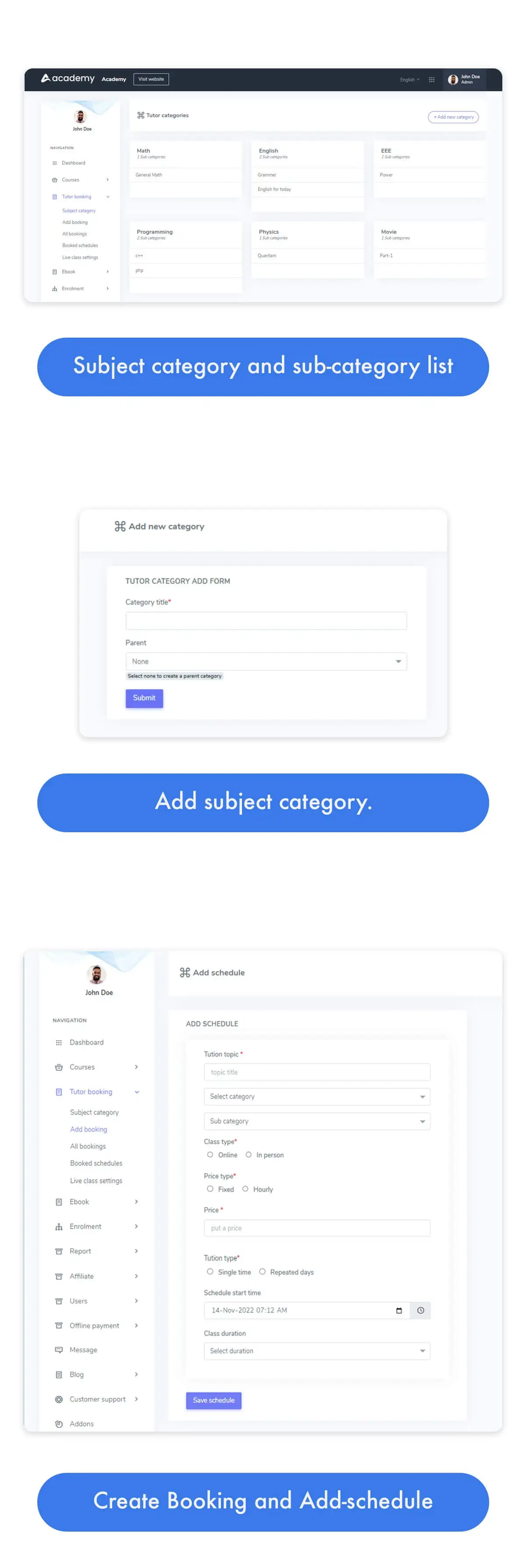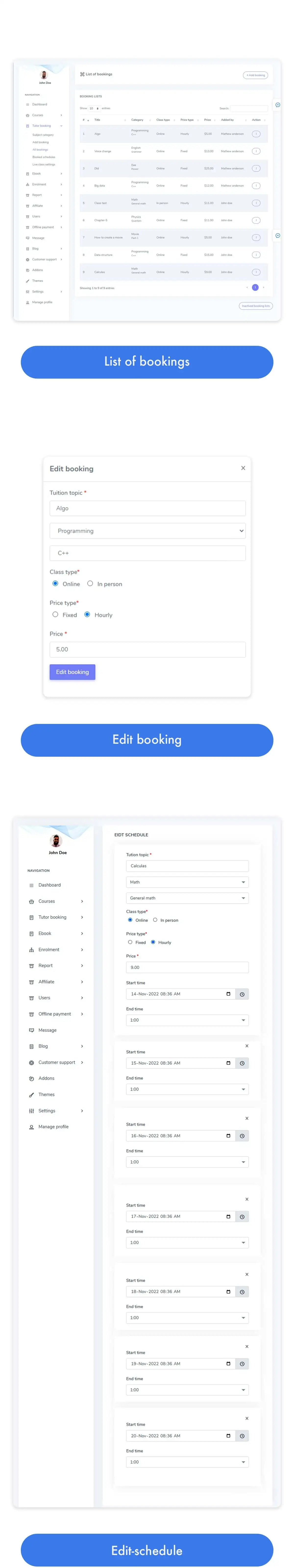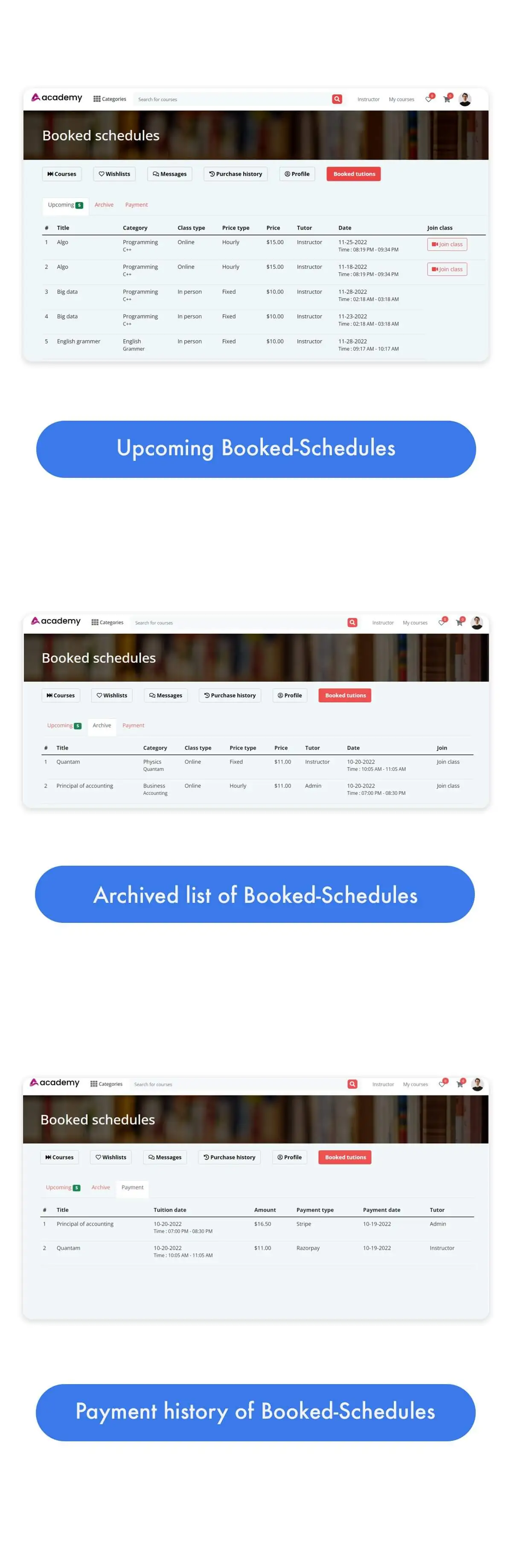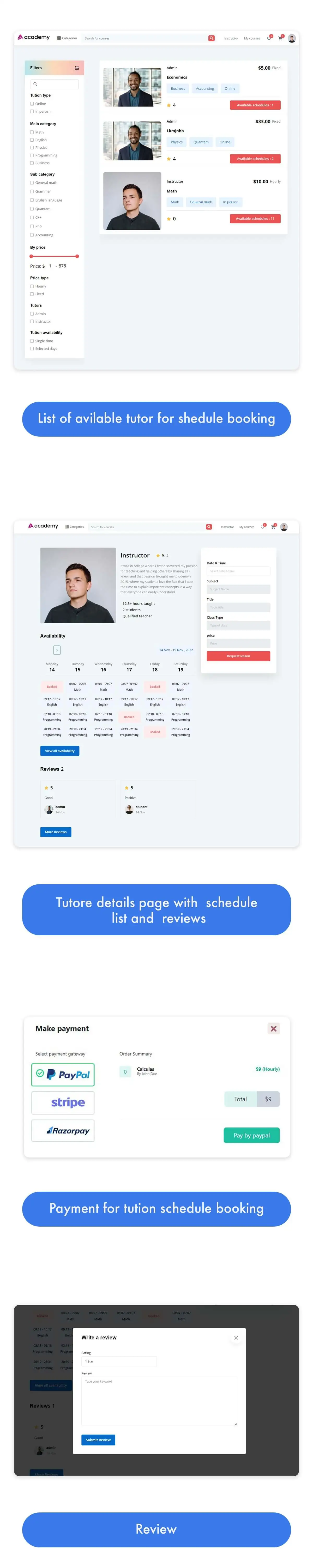 This addon provides teacher appointment booking facility for Academy LMS students. Students can choose tutors for different classes and tutors can conduct their classes as per their regularly scheduled class schedule through online live video or in person both. As an admin, you can earn commissions when your students pay for booking instructors through your application.