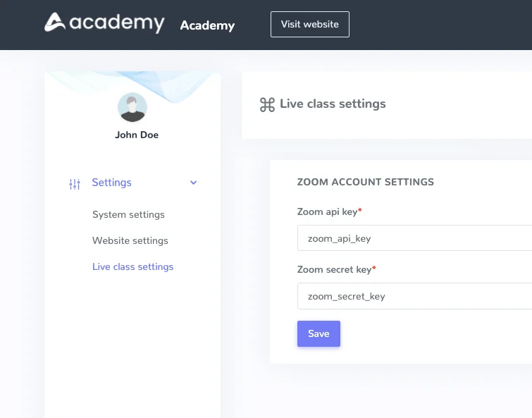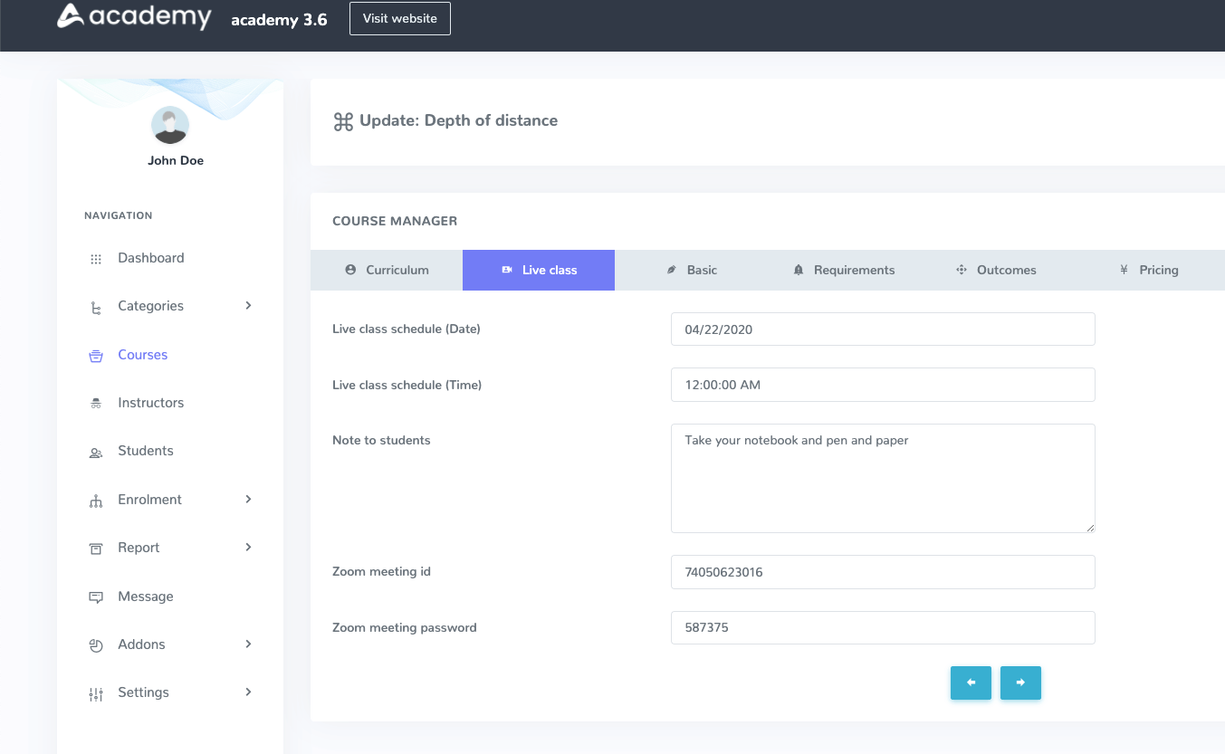 This addon provides Academy LMS instructors taking online class to course students using zoom live streaming service.