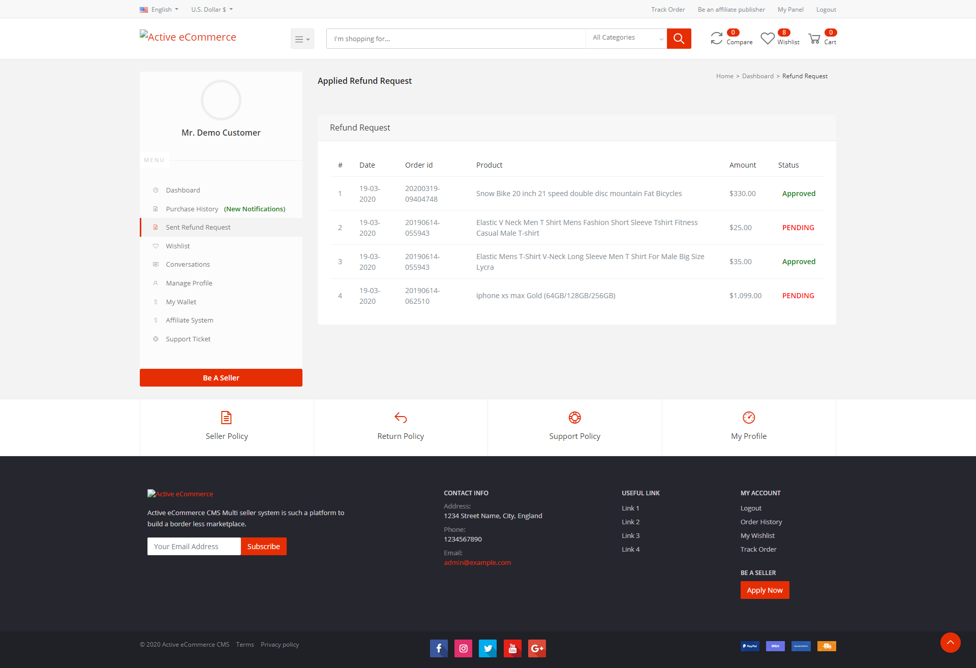 Purchase today! & use Refund System for your eCommerce business which is only developed with the most efficient eCommerce cms named Active eCommerce cms. Product refund is the process by which a customer will be able to request a refund for his/her previously purchased product with definite reason and if the retailer or vendor approves the refund, the refunded amount will be added to the customer’s wallet. So, later on, with this added amount, the customer can purchase again (different product than the refunded one).