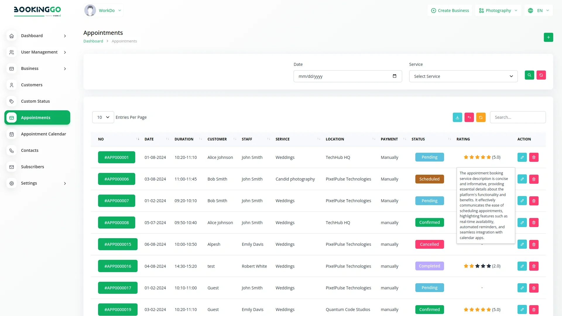 Elevate your BookingGo SaaS marketplace with the Appointment Review Module, a powerful tool designed to enhance customer engagement and satisfaction. With this feature enabled, customers can easily leave ratings for staff directly from the frontend interface, while admins gain valuable insights through the Manage Business Module.