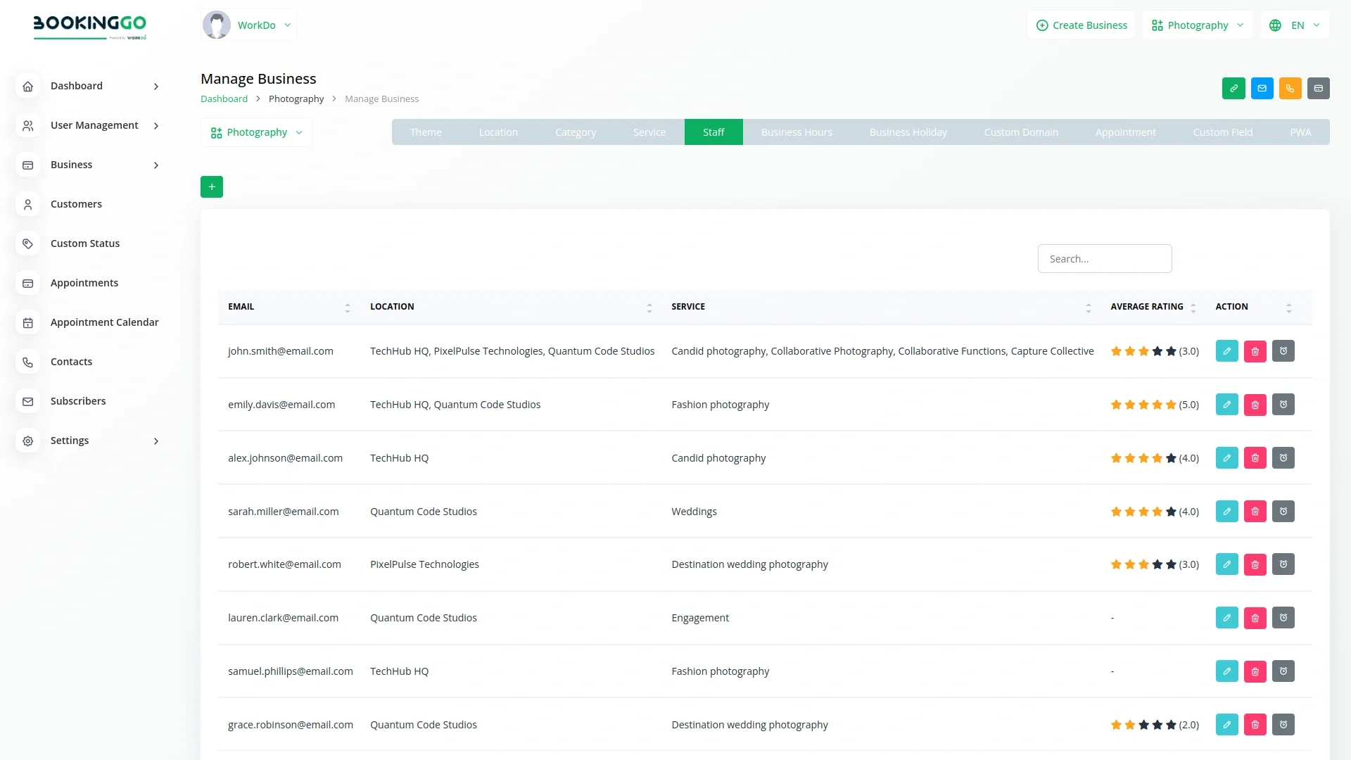 Admins gain valuable insights into staff performance through the Manage Business Module. Here, they can access comprehensive ratings data, including staff ratings and feedback submitted by customers. This data empowers admins to monitor performance, identify areas for improvement, and implement strategies to enhance customer satisfaction.