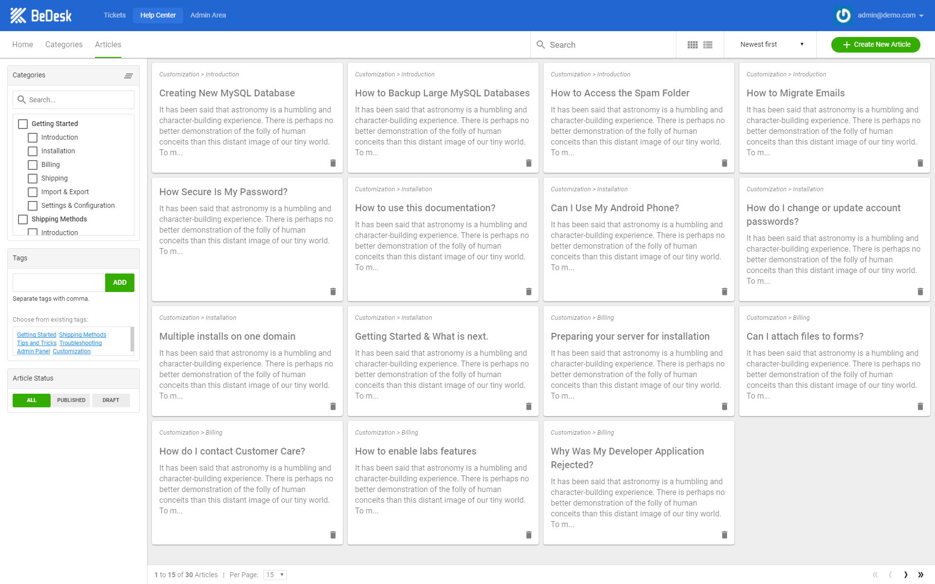 - Knowledgebase Management – Organize your knowledge base using categories and tags, create articles with a powerful html editor.