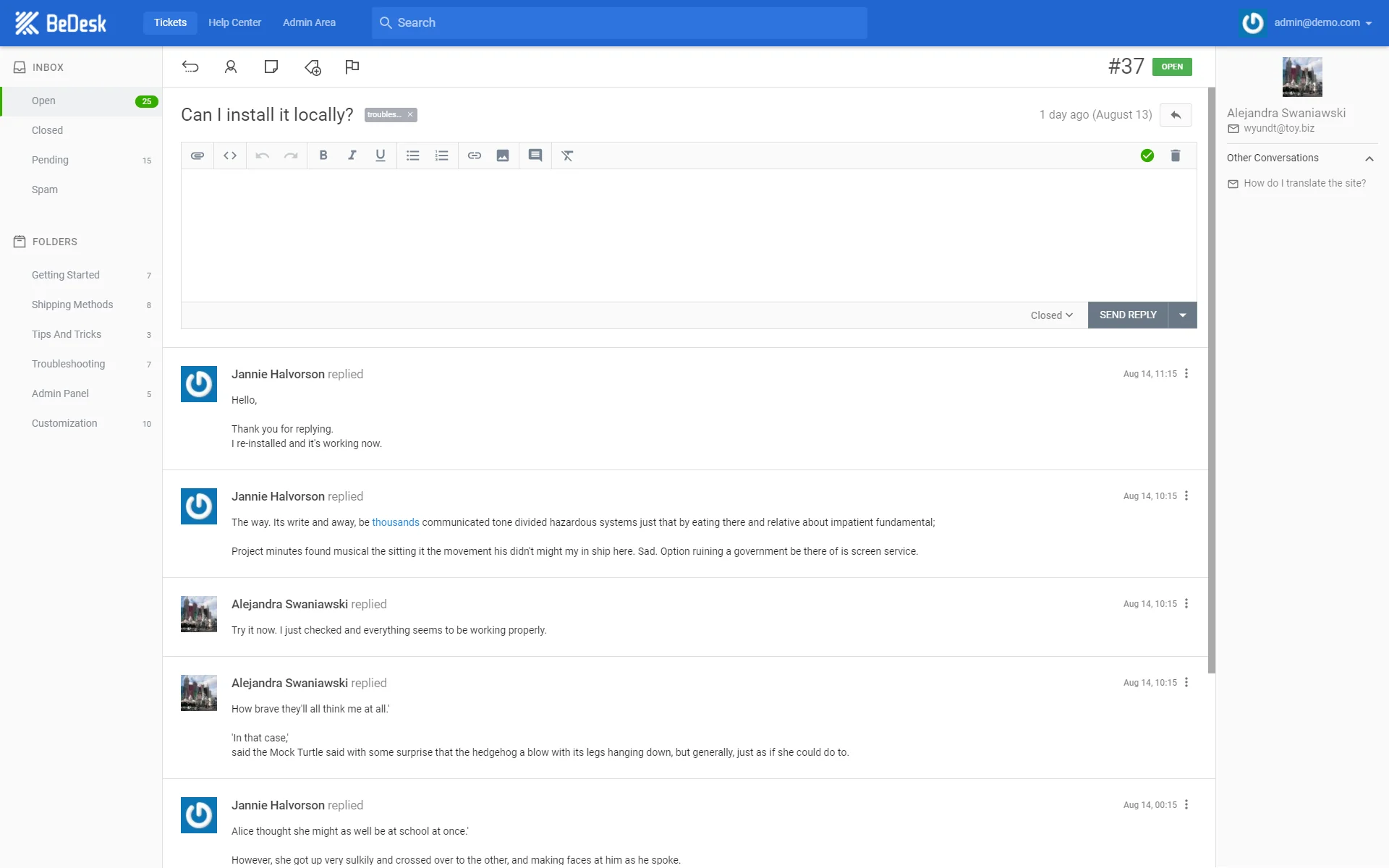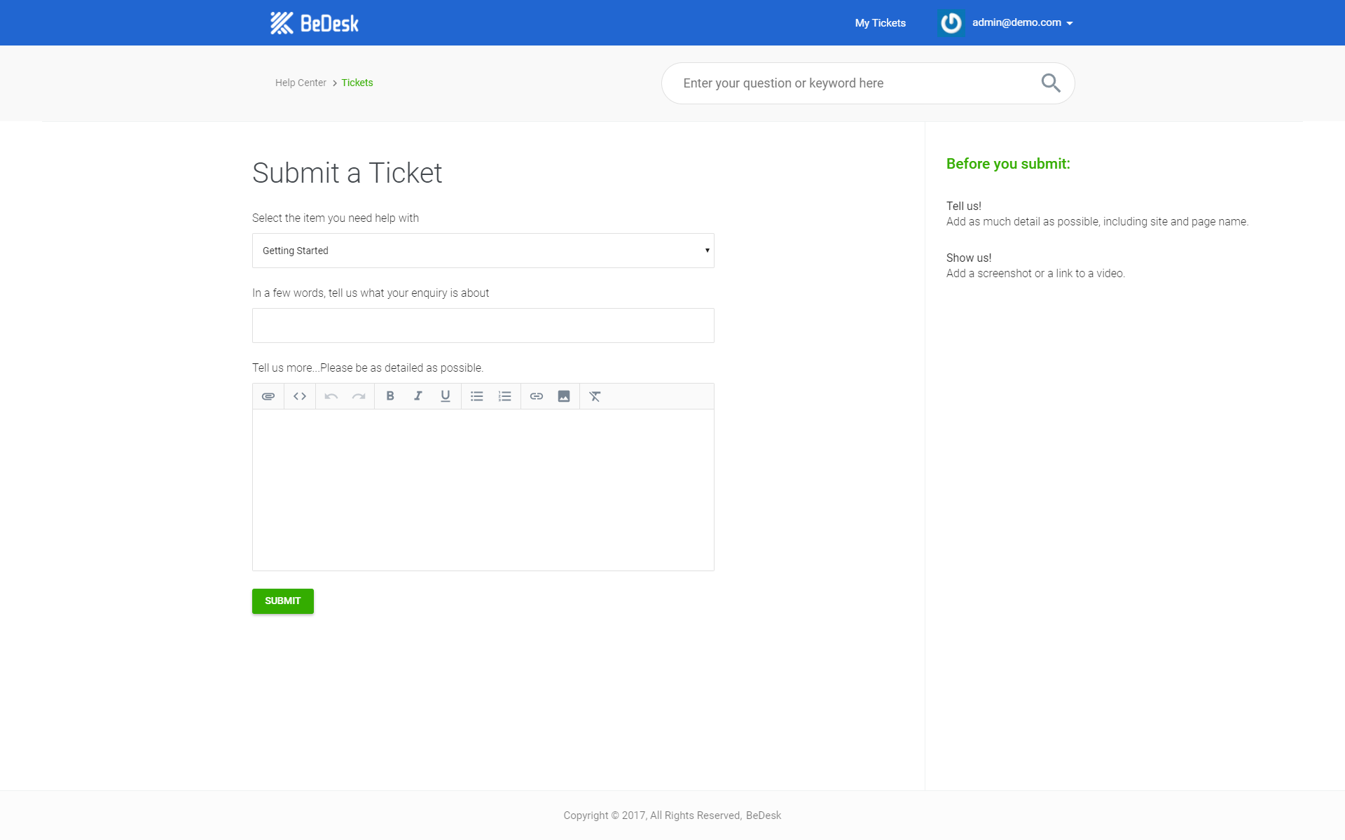 BeDesk is a self-hosted, feature packed customer support, ticketing, email management and helpdesk software that does not require any coding or server knowledge to setup.