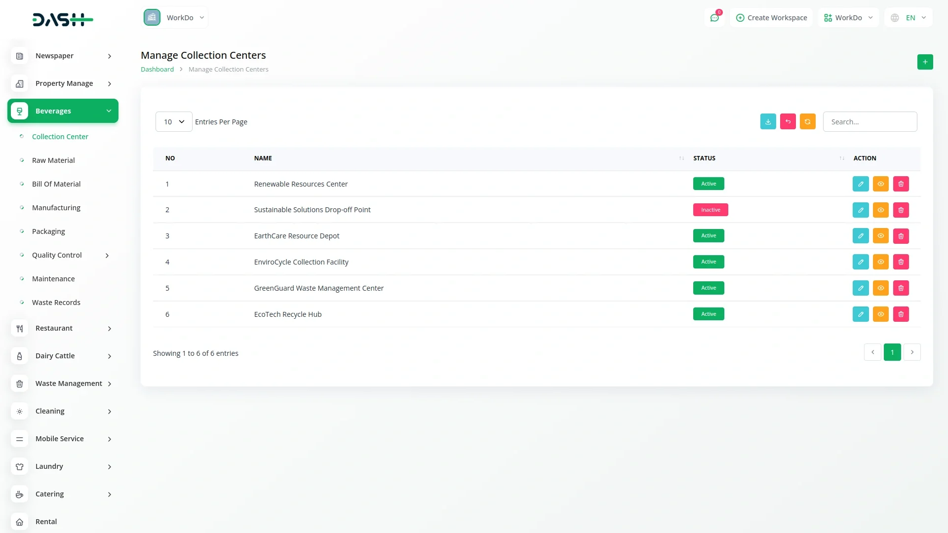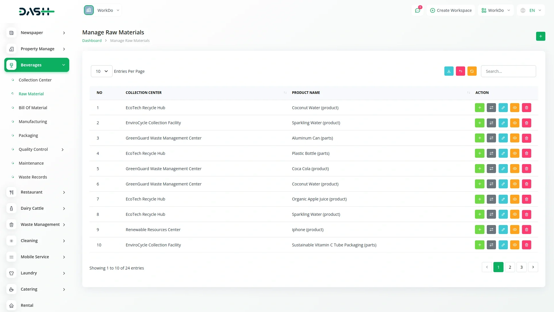 Efficiently manage raw materials by selecting a collection center and then choosing the desired product or service items separately. Once an item is selected, the system auto-fills its name, description, tax, price, unit, and image to streamline input. You can set the raw material status (active/inactive) for availability control. Additionally, manage stock levels, move materials from one collection center to another, and perform key actions like viewing, editing, or deleting entries to maintain clean and accurate inventory records.