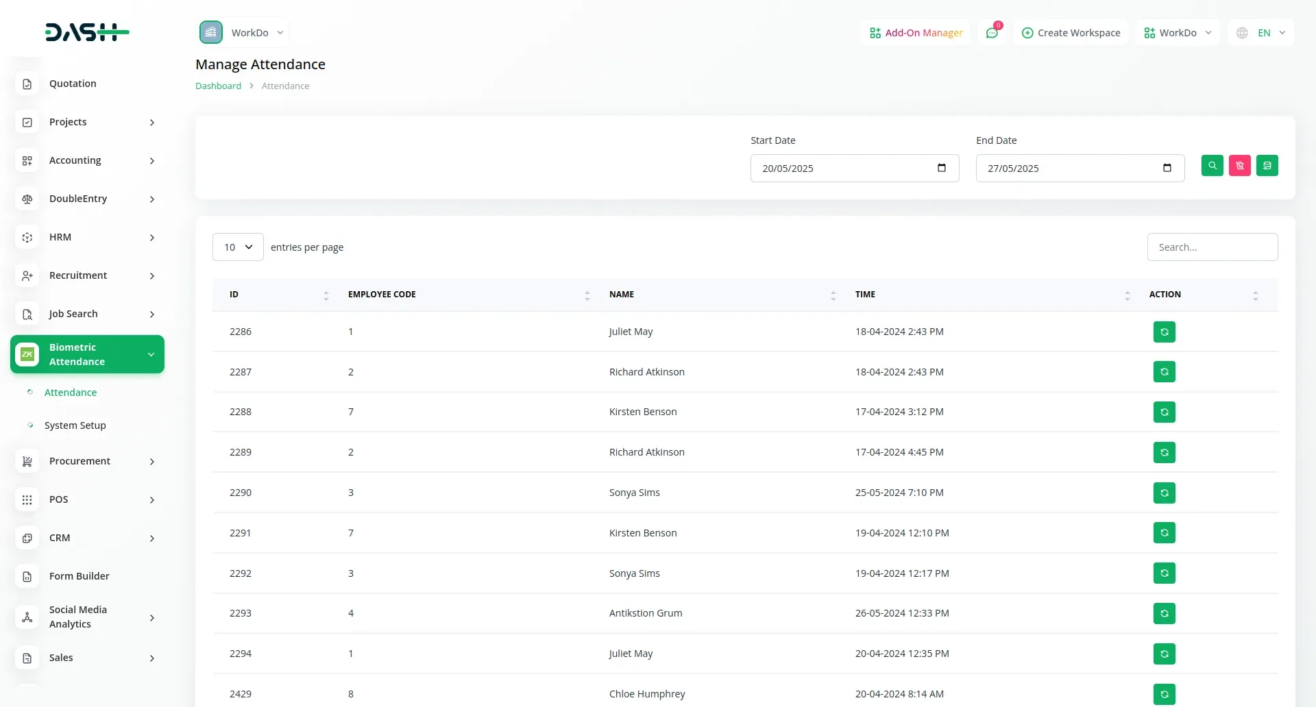 This Add-On enables efficient management of employee attendance through biometric data synchronization. Users can sync biometric data from connected devices and automatically update attendance records in the HRM system. The interface displays employee details including employee code, name, and attendance time, simplifying monitoring and reporting. The sync process is initiated manually using a dedicated button, ensuring accurate real-time attendance tracking. This solution helps streamline workforce management by reducing manual errors and automating attendance recording.
