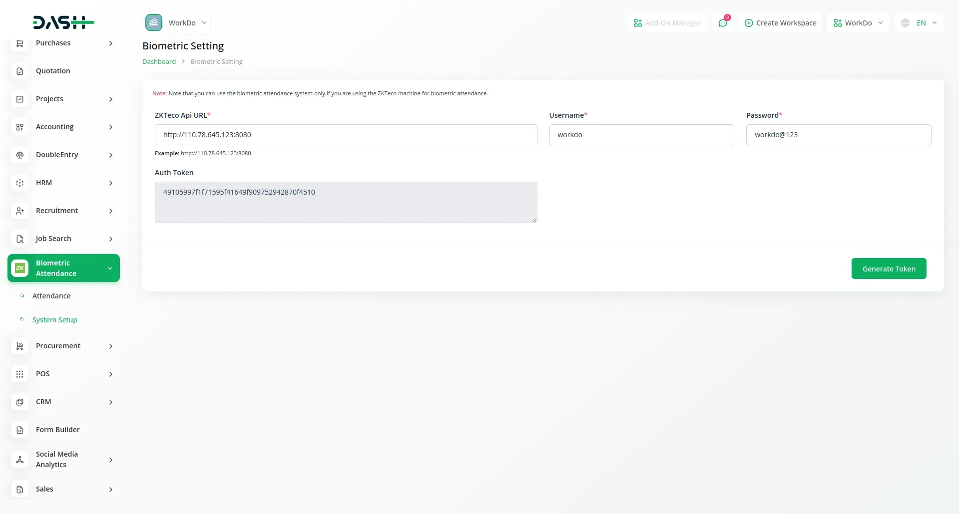 This setup section allows administrators to configure biometric device connectivity through secure API credentials. Users can enter ZKTeco API URL, username, and password to establish a connection. The system supports token generation to authenticate and securely communicate with biometric devices. This ensures smooth and protected data transfer from the biometric hardware to the attendance management system. Easy configuration simplifies device integration, enabling businesses to automate attendance without technical complications.