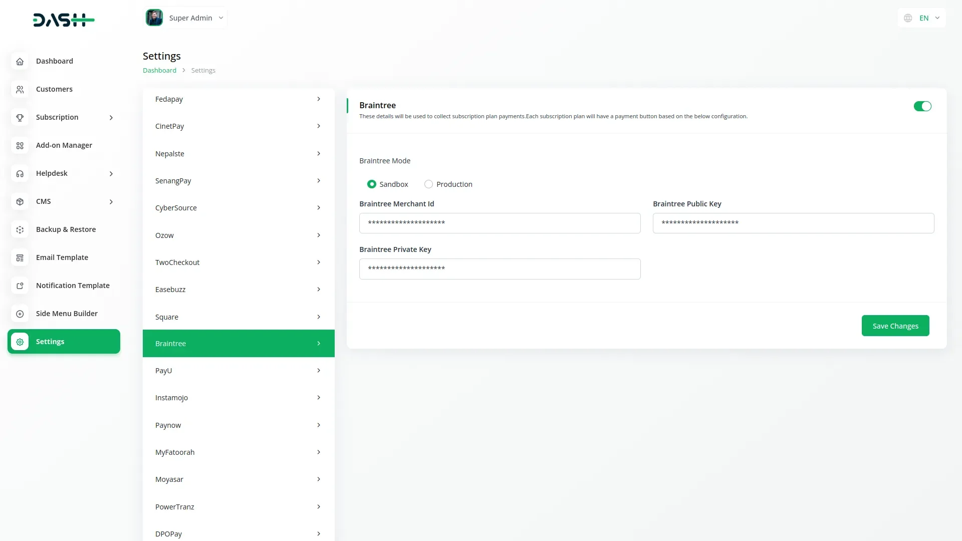 The API Key Settings Page for Braintree Integration allows you to securely connect your application or website with the Braintree payment gateway. By configuring your API keys on this page, you enable your platform to interact with Braintree services, providing seamless payment processing and transaction management. Both Superadmin and Company accounts can utilize this integration, though each has a specific focus. The Superadmin integration is primarily for handling subscription-based payments, while the Company integration handles payments related to invoices and other one-time transactions. Both roles share the same integration setup, ensuring ease of use and consistency across the platform.