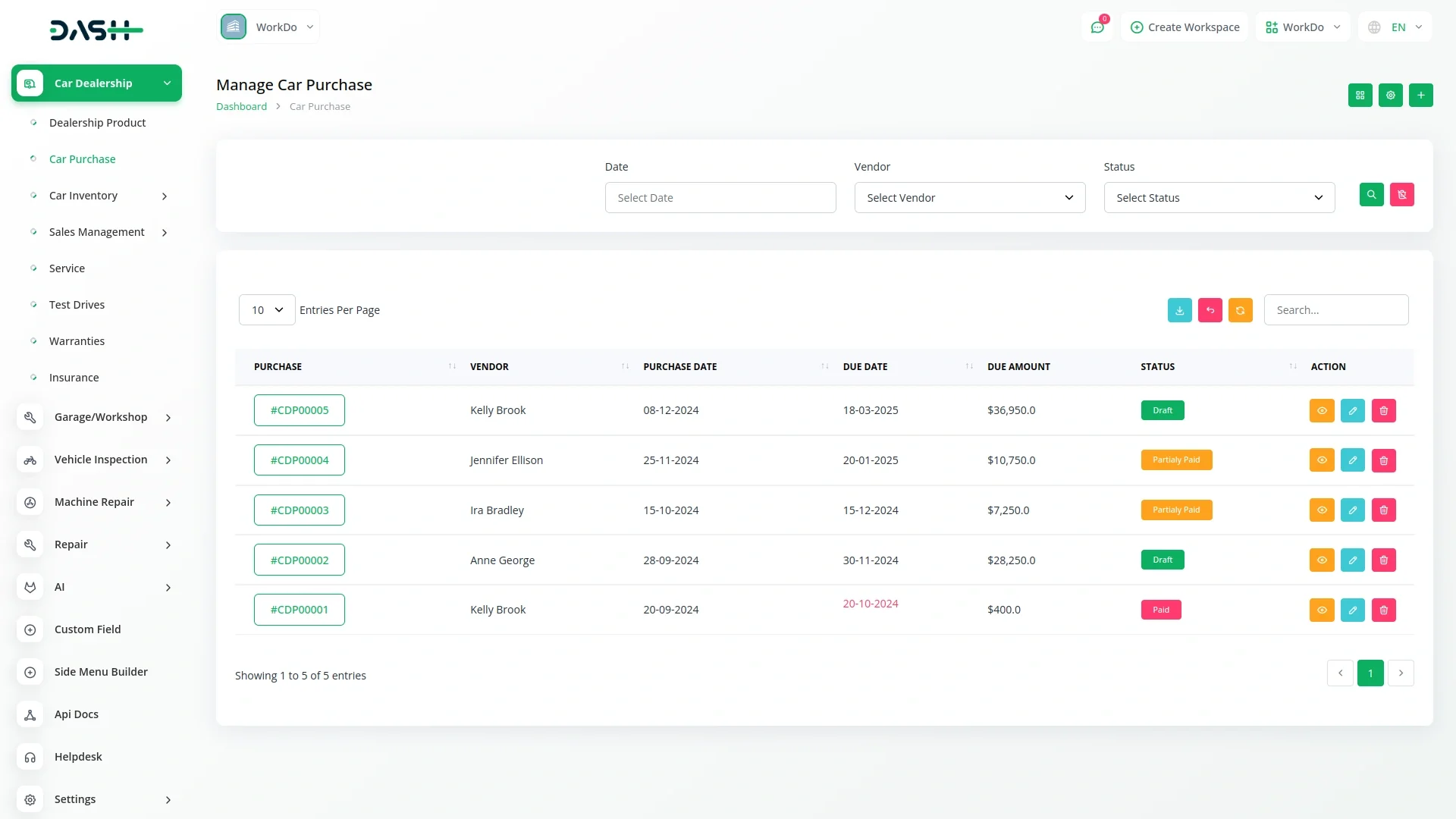 The Car Dealership – Dash SaaS Add-On is a feature-rich solution tailored for car dealerships to streamline their vehicle sales, inventory, customer relationships, and service management processes. This add-on enables seamless tracking of new and used car inventories, automates sales workflows, manages leads and test drives, and handles invoicing and documentation—all in one place. Designed to boost sales performance and operational efficiency, it helps dealerships deliver a professional, organized, and customer-centric experience using the Dash SaaS platform.