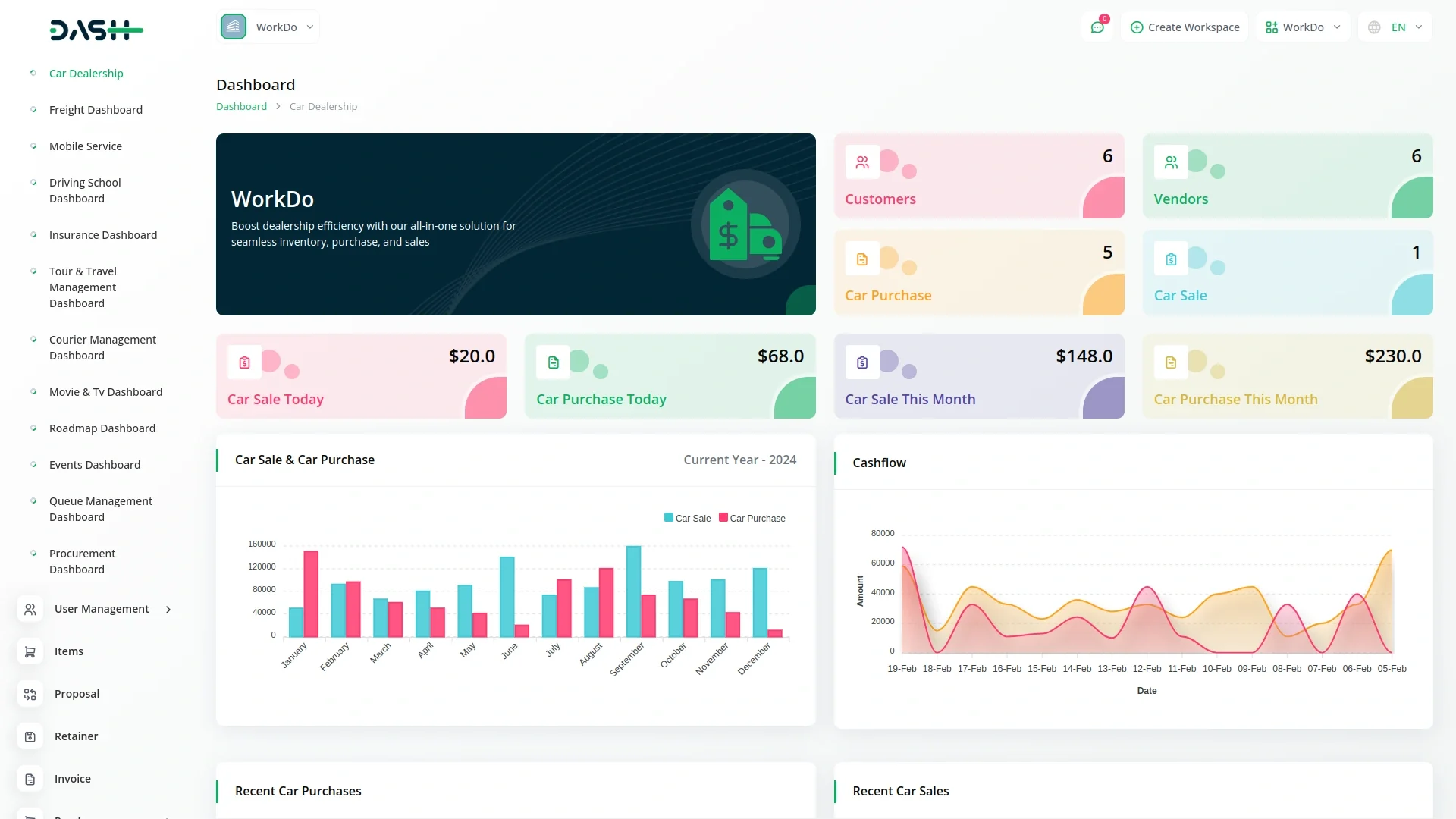 Welcome to Dash SaaS Car Dealership Integration! Your dashboard serves as the control center for your dealership, offering a comprehensive overview of performance metrics. You can track total customers and vendors, providing insights into your dealership's reach and the strength of your supplier network. Additionally, metrics on total car purchases and sales offer vital information for evaluating operational efficiency. The bar graph comparing car sales to purchases facilitates informed decision-making on inventory management strategies. Meanwhile, the cash flow graph visually represents your dealership's financial health, aiding in budgeting and forecasting efforts.