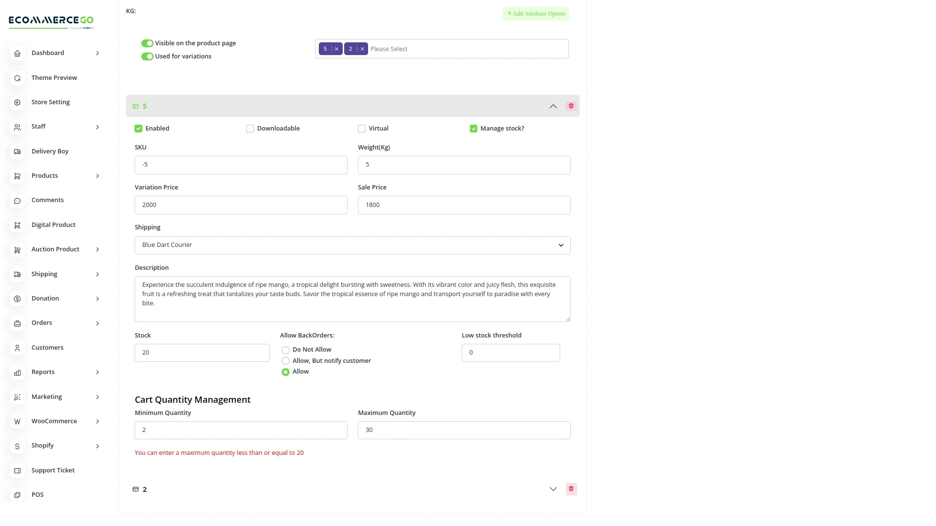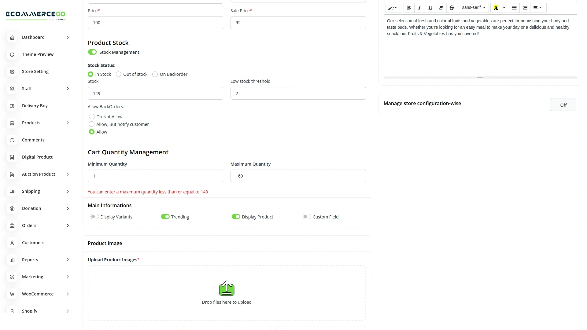 The Cart Quantity Control – eCommerceGo Add-On allows store owners to manage and restrict the minimum and maximum product quantities that customers can add to their cart. This feature ensures better inventory management, avoids bulk misuse, and provides flexibility in order handling.