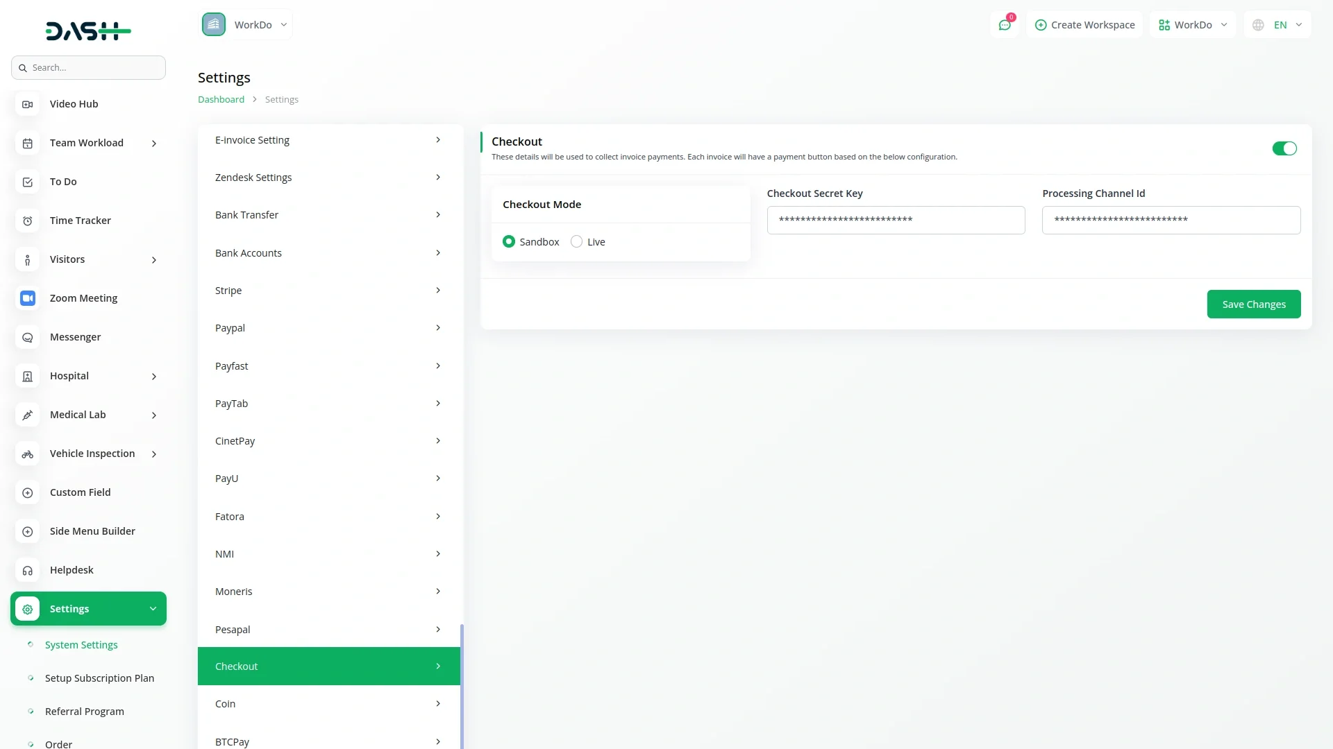 The API Key Settings Page for Checkout Payment Integration allows you to securely connect your application or website with the Checkout Payment payment gateway. By configuring your API keys on this page, you enable your platform to interact with Checkout Payment services, providing seamless payment processing and transaction management. Both Superadmin and Company accounts can utilize this integration, though each has a specific focus. The Superadmin integration is primarily for handling subscription-based payments, while the Company integration handles payments related to invoices and other one-time transactions. Both roles share the same integration setup, ensuring ease of use and consistency across the platform.