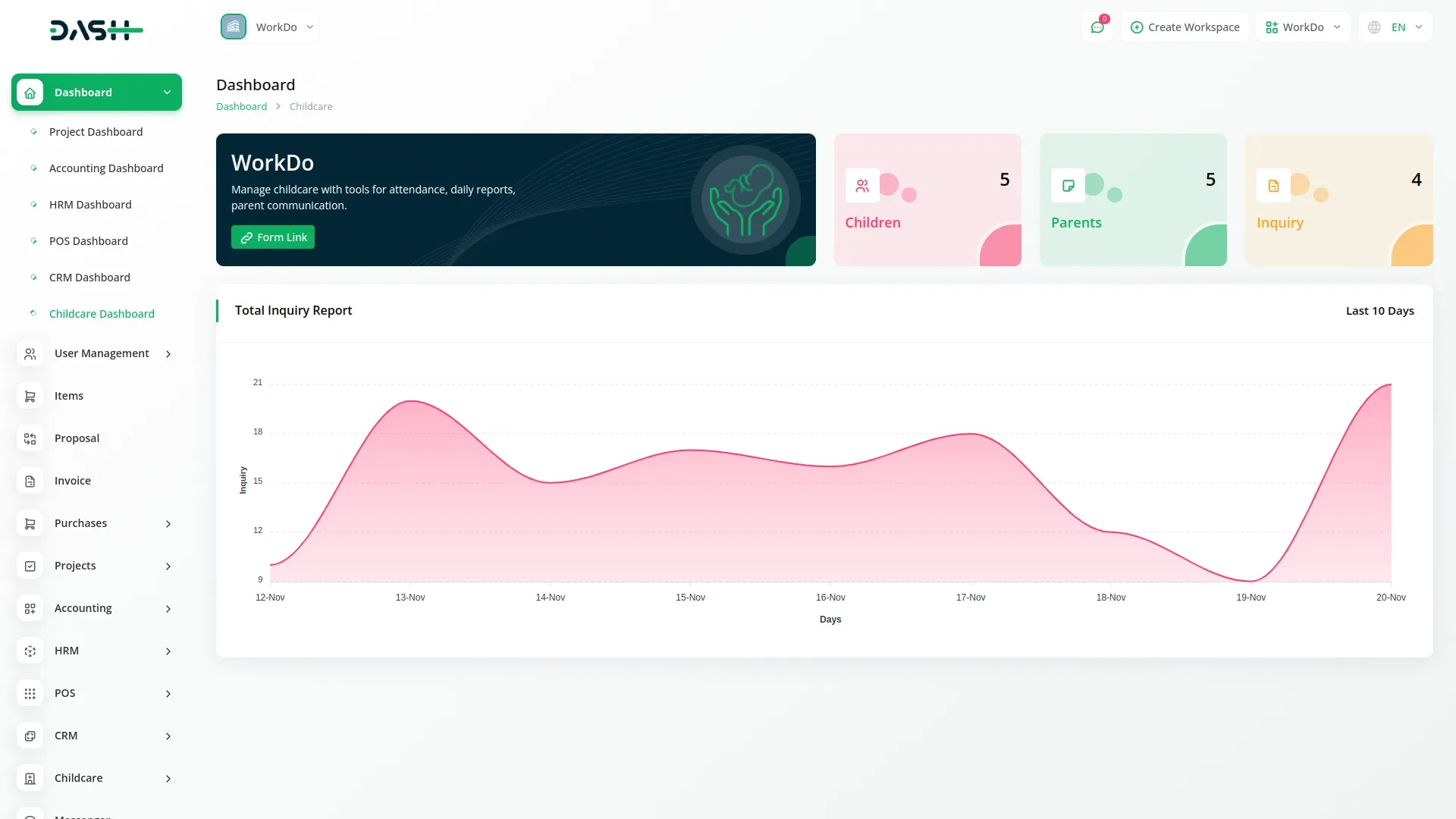 Childcare Management – Dash SaaS Add-On is an all-in-one solution crafted for daycare centers, preschools, and early education providers to manage daily operations with ease. This add-on simplifies enrollment, attendance tracking, billing, parent communication, staff scheduling, and child activity monitoring. By automating administrative tasks and enhancing transparency, it helps childcare providers focus more on nurturing and education, all while running efficiently within the Dash SaaS ecosystem.