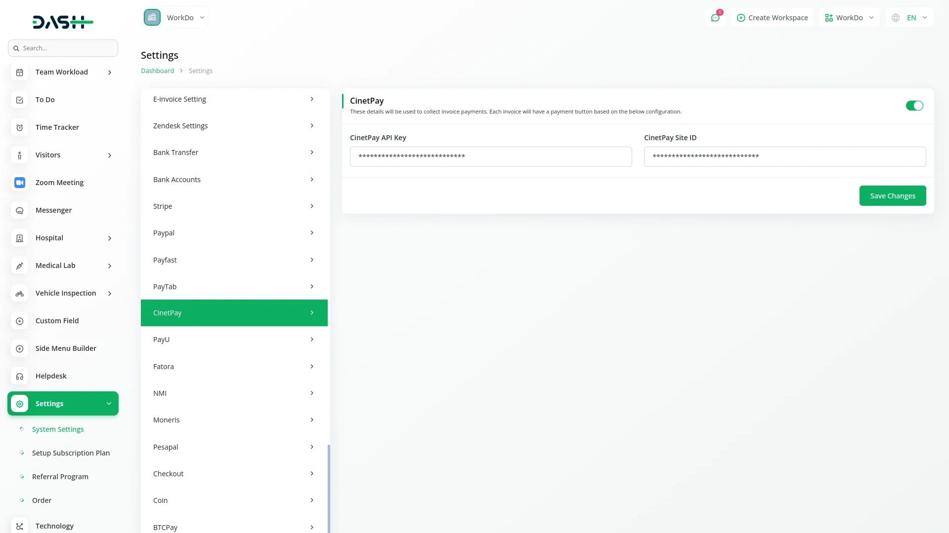 CinetPay – Dash SaaS Add‑On is a secure and efficient payment gateway integration built for the WorkDo Dash SaaS ERP platform, offering tailored payment support across Francophone West African markets. It enables seamless processing of one-time and recurring transactions—including invoices, retainer payments, and subscription plans—using popular regional methods like mobile money, bank transfers, and credit/debit cards.