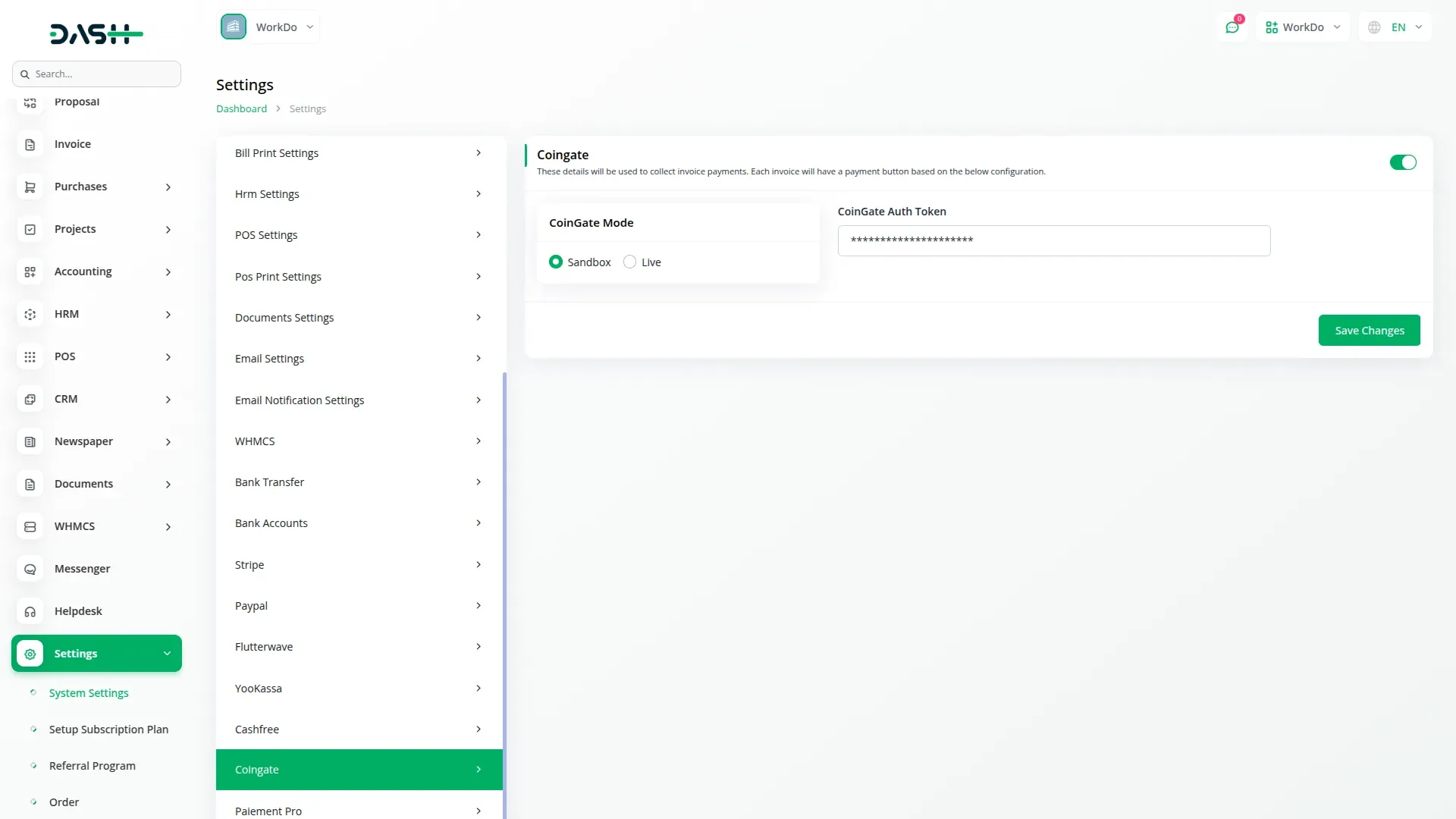 The API Token Settings Page for CoinGate Integration allows you to securely connect your application or website with the CoinGate payment gateway. By configuring your API keys on this page, you enable your platform to interact with CoinGate services, providing seamless payment processing and transaction management. Both Superadmin and Company accounts can utilize this integration, though each has a specific focus. The Superadmin integration is primarily for handling subscription-based payments, while the Company integration handles payments related to invoices and other one-time transactions. Both roles share the same integration setup, ensuring ease of use and consistency across the platform.