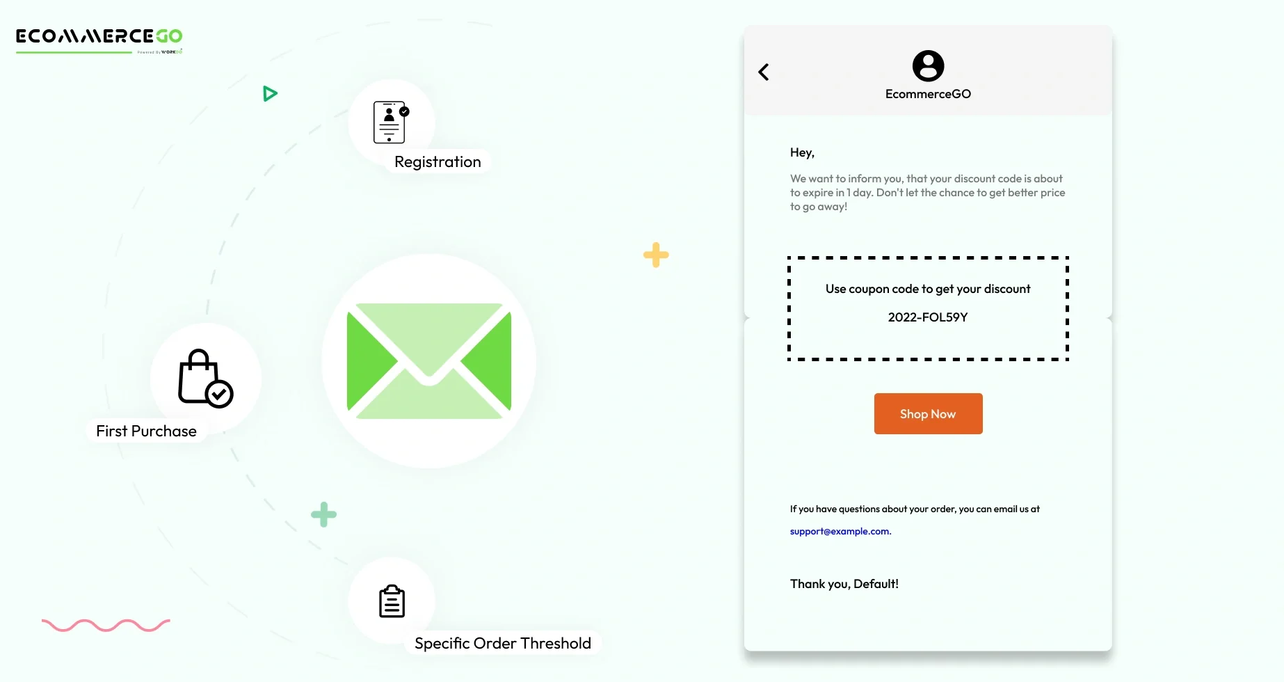 With eCommerceGo SaaS, you have the flexibility to choose from three options to trigger email coupon delivery: user registration, first purchase, or specific order threshold. This allows you to tailor your offers to different stages of the customer journey, maximizing relevance and effectiveness. Whether you want to incentivize new sign-ups, reward first-time buyers, or encourage repeat purchases, our module has you covered.