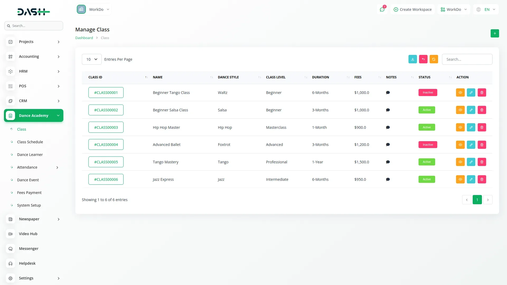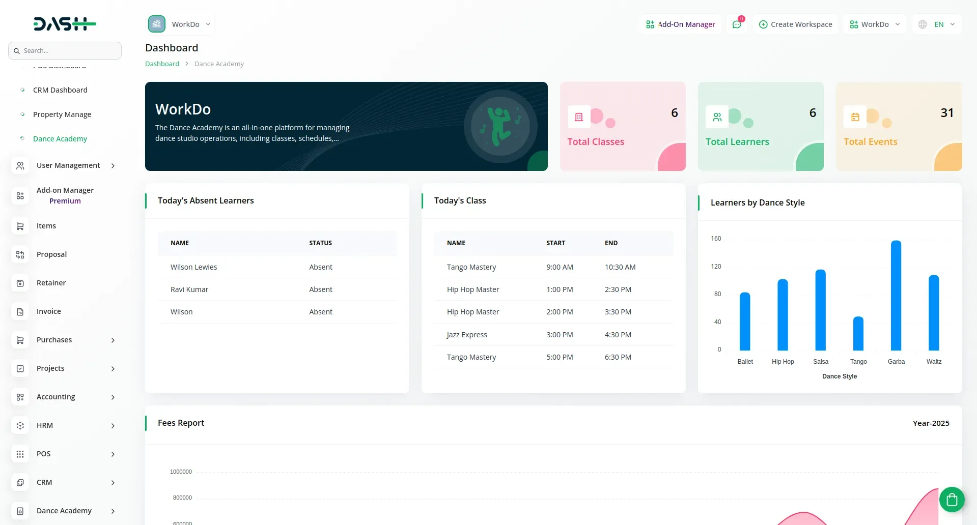 The Dance Academy add-on for Dash SaaS delivers a complete management solution for dance schools, studios, and training centers. It allows administrators and instructors to organize classes, manage batches, track student progress, and run studio operations from one centralized interface. With tools for scheduling, enrollment, instructor assignments, and attendance monitoring, this add-on streamlines workflows and enhances both teaching and learning experiences.