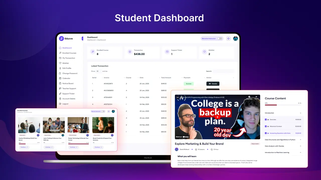 Educve LMS is a modern and feature-rich learning management system (LMS) designed for educational institutions, training centers, instructors, and eLearning platforms to create, manage, and deliver online courses with ease. Whether you're building a virtual classroom, launching an online school, or selling digital courses, Educve LMS provides all the tools you need to engage learners and grow your education business.