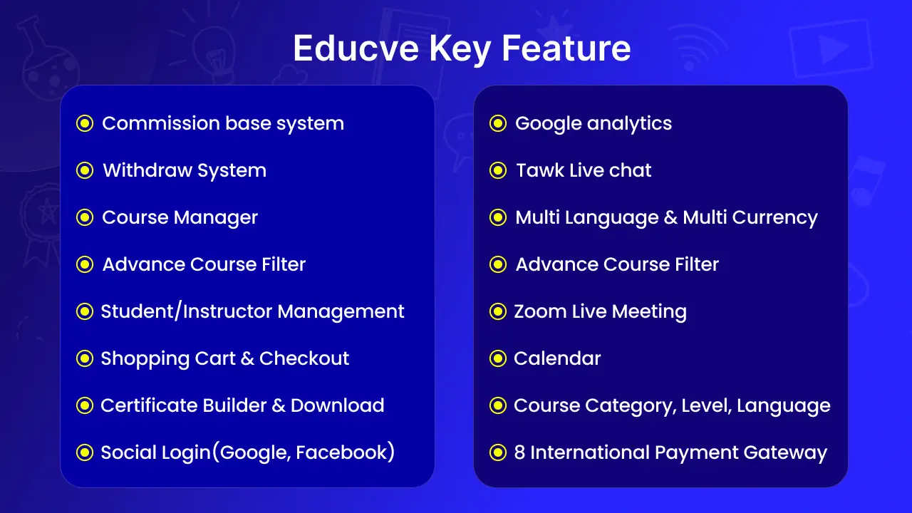 Educve LMS – Learning Management System is engineered to adapt to the evolving demands of online Learning, providing advanced functionalities and customization options to suit your unique requirements. Which is specially made for academy, ai, education, Edulab, Laravel e-Learning software, lms, module lms, online professional course, Organization LMS, paypal, skillshare, stripe, tutor lms, udemy, zoom