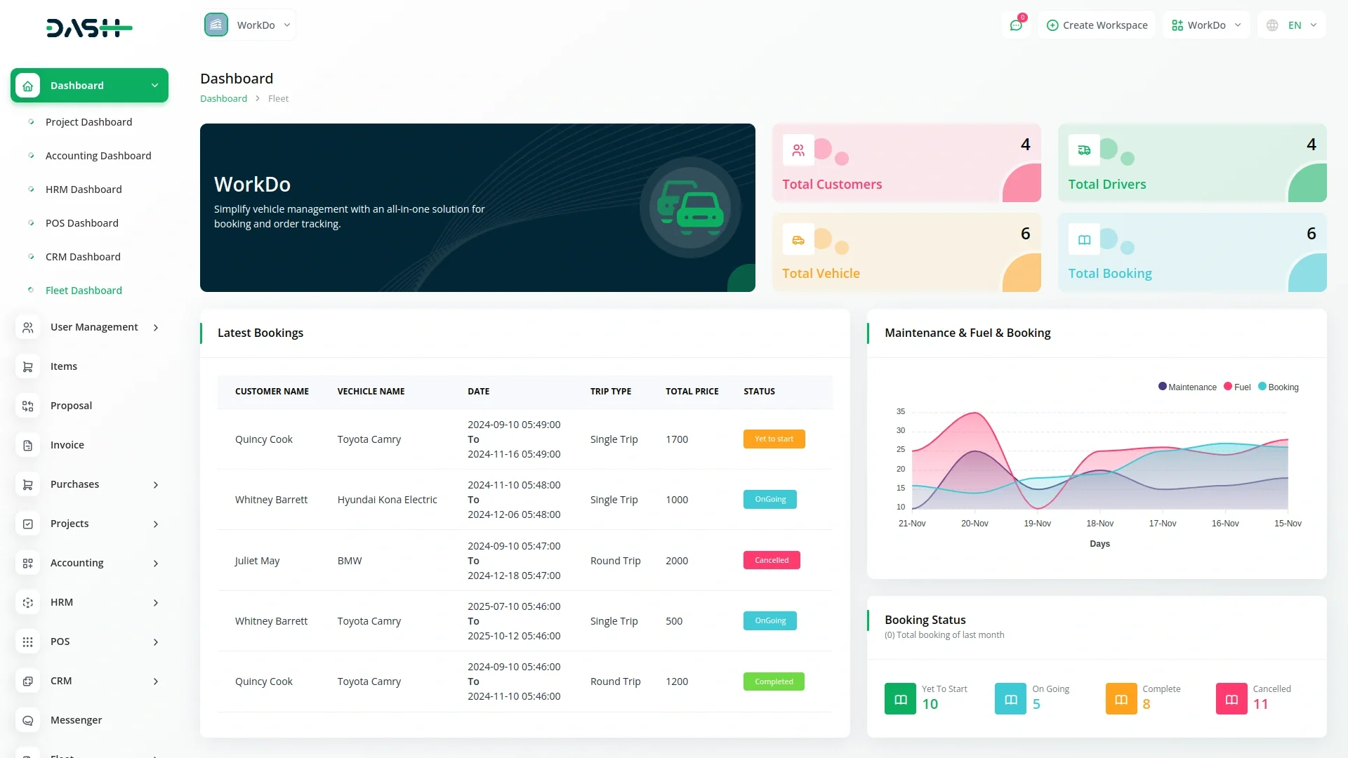 Fleet – Dash SaaS Add-On is a robust fleet management software extension designed for the Dash SaaS ecosystem. This module enables businesses to efficiently manage and monitor their vehicle fleets, including real-time GPS tracking, fuel usage, maintenance schedules, driver logs, and route planning. Perfect for logistics companies, transportation services, and delivery-based businesses, the Fleet add-on enhances operational efficiency, minimizes downtime, and ensures better compliance with safety and regulatory standards. Seamlessly integrated with Dash SaaS, it provides centralized control for all fleet-related operations.