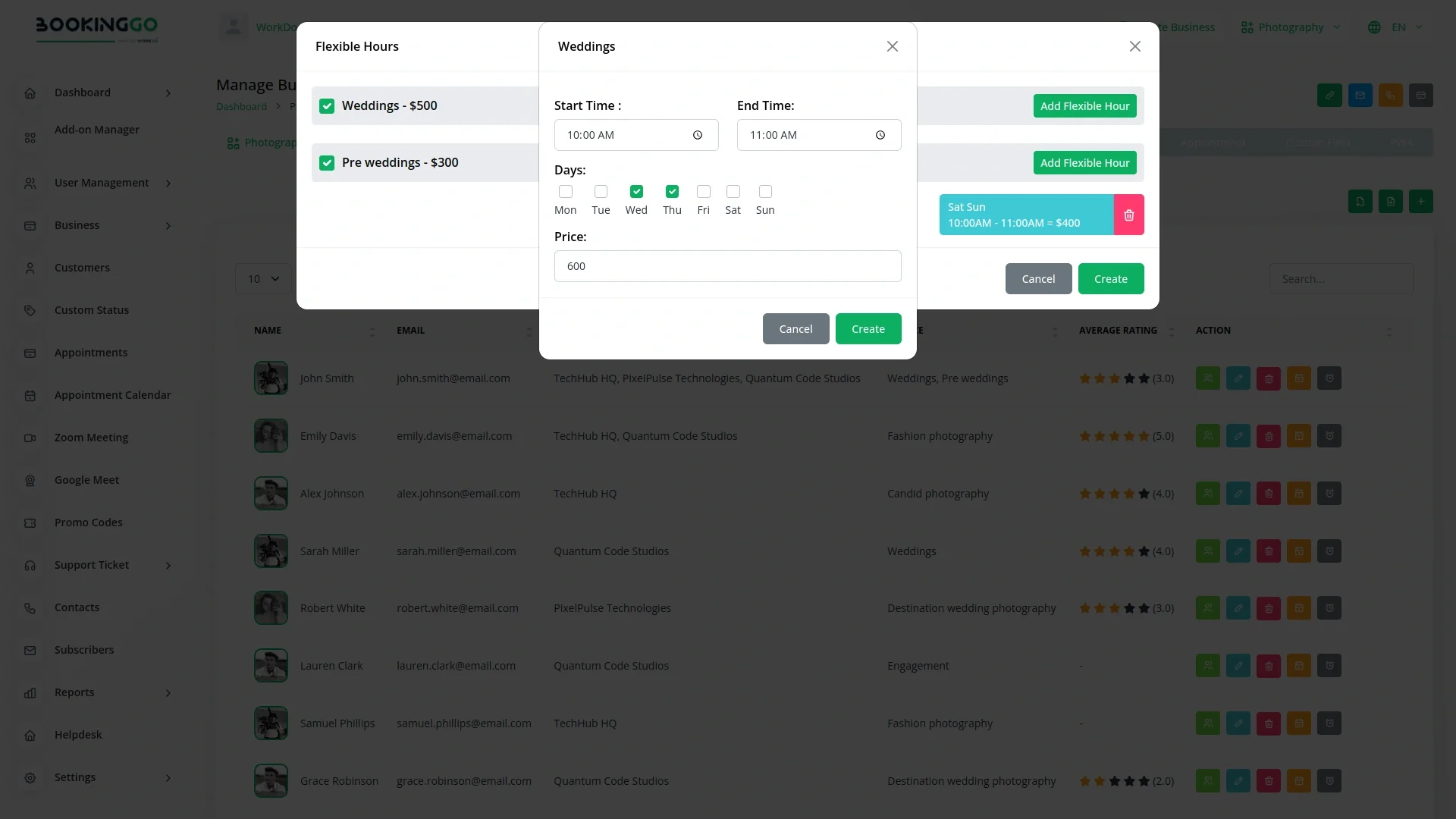 By utilizing BookingGo's Flexible Hours Functionality, you gain the freedom to manage your schedule according to your needs. This flexibility allows you to achieve a better work-life balance and optimize your productivity. Focus on delivering exceptional service to your clients without worrying about managing pricing details. The flexible hours that you have added will be highlighted on the front end, so that the users don’t get confused.