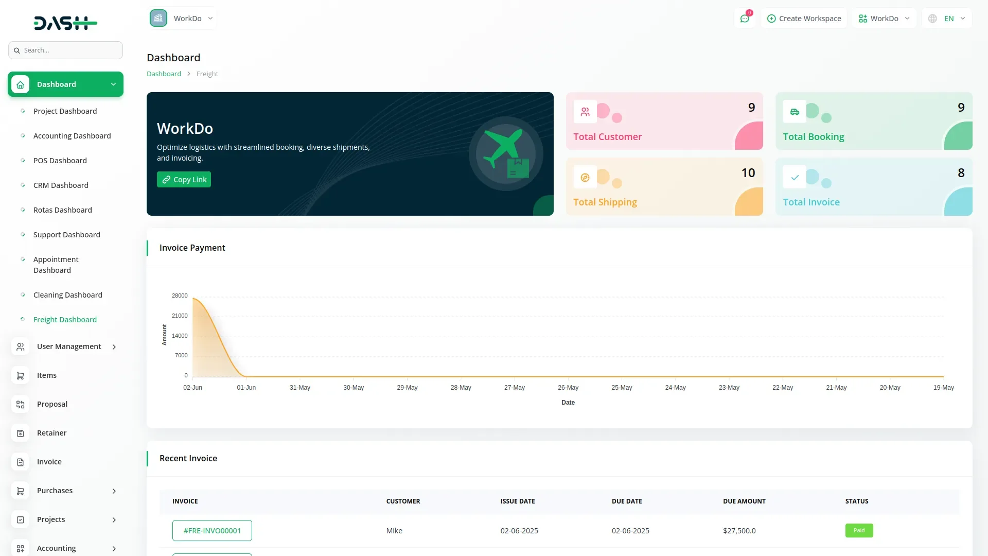Freight Management System – Dash SaaS Add-On.Simplify and automate logistics operations with the Freight Management System – Dash SaaS Add-On. Ideal for freight forwarders, logistics providers, and transport companies, this add-on enables you to manage freight bookings, shipment tracking, carrier coordination, invoicing, and documentation—all from a centralized dashboard. Seamlessly integrated with Dash SaaS, this freight management software boosts efficiency, reduces manual errors, and enhances visibility across the entire supply chain.