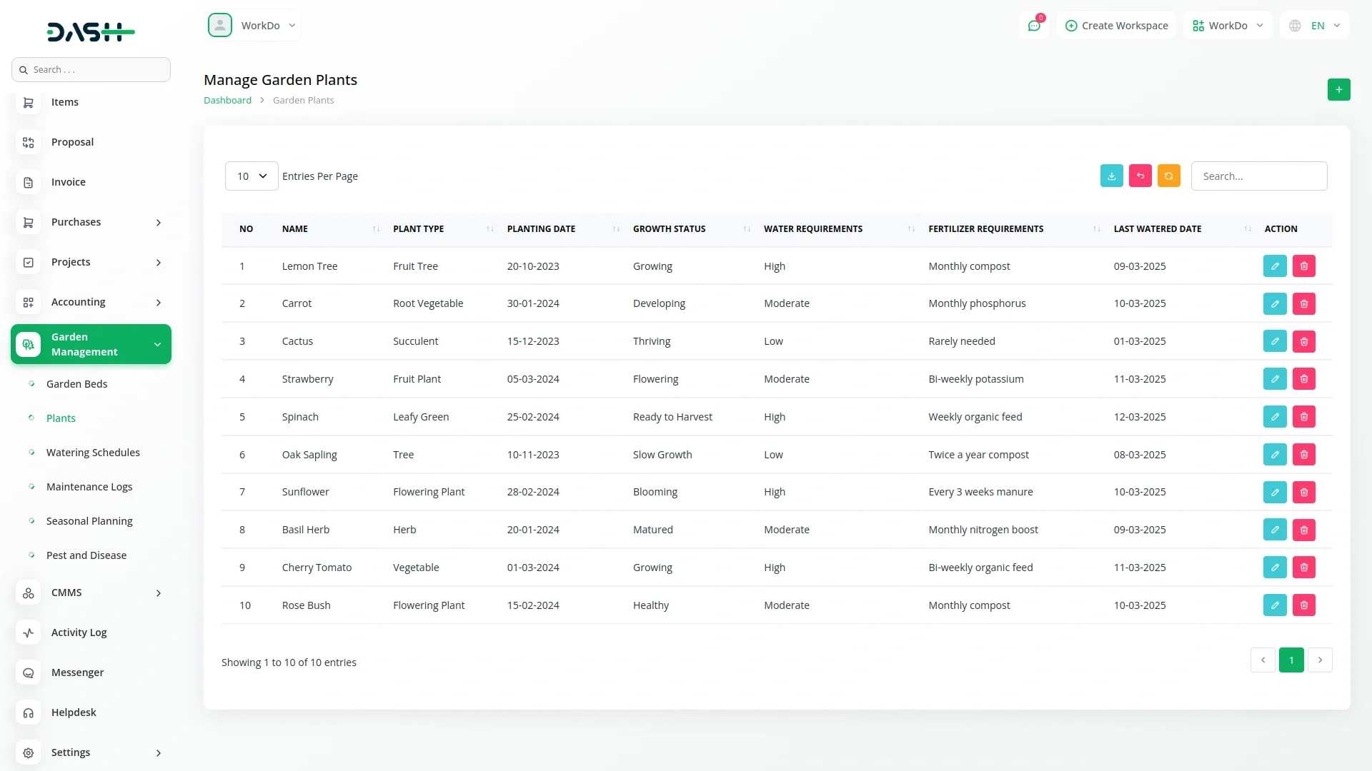 Garden Management – Dash SaaS Add-On is a specialized tool for managing gardens, parks, nurseries, and landscaped areas. It offers features such as plant inventory tracking, watering and fertilizing schedules, maintenance task assignment, seasonal planning, and staff management. Fully integrated with Dash SaaS, this add-on streamlines horticultural operations, improves garden upkeep, and helps ensure healthy and visually appealing green spaces.