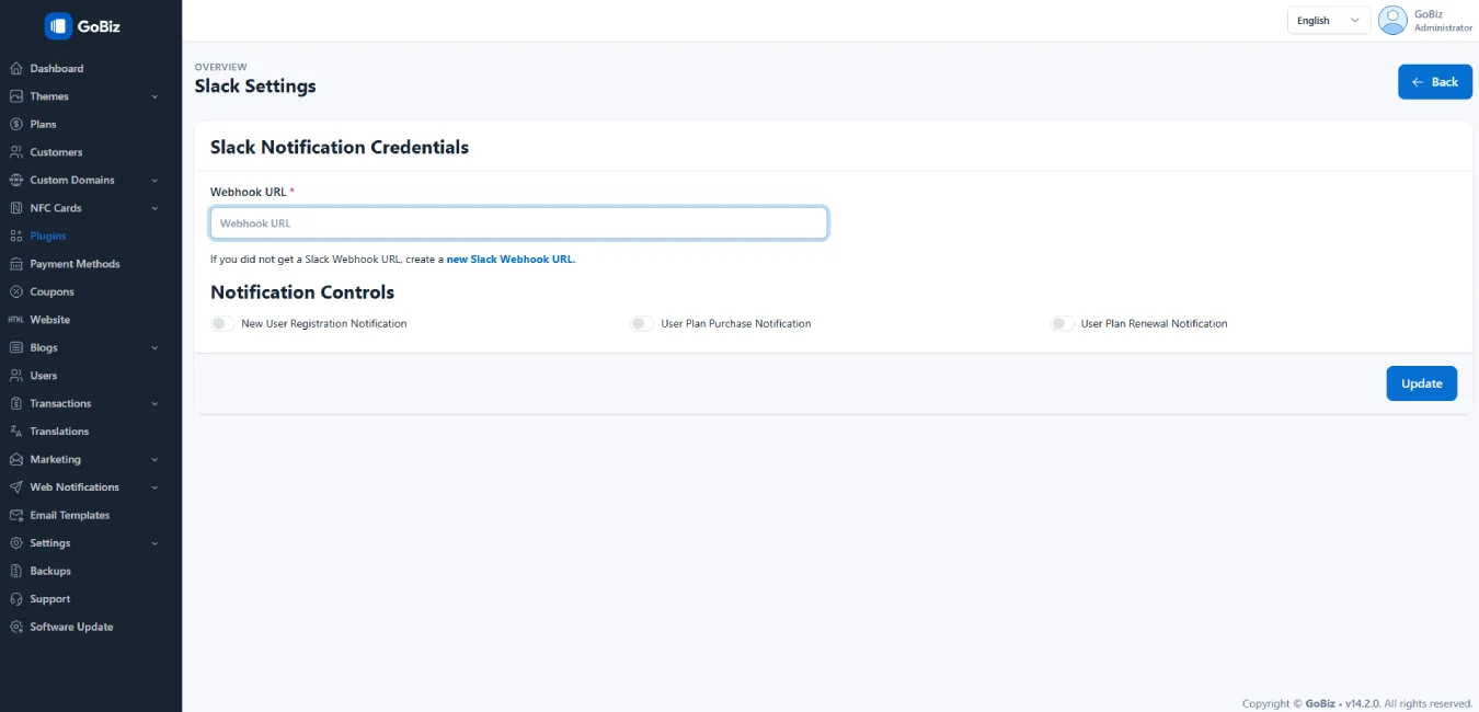 Enhance your GoBiz vCard SaaS with real-time Slack notifications! This addon ensures instant alerts for new user registrations, plan purchases, renewals, application error notifications and important updates—delivered directly to your Slack workspace.