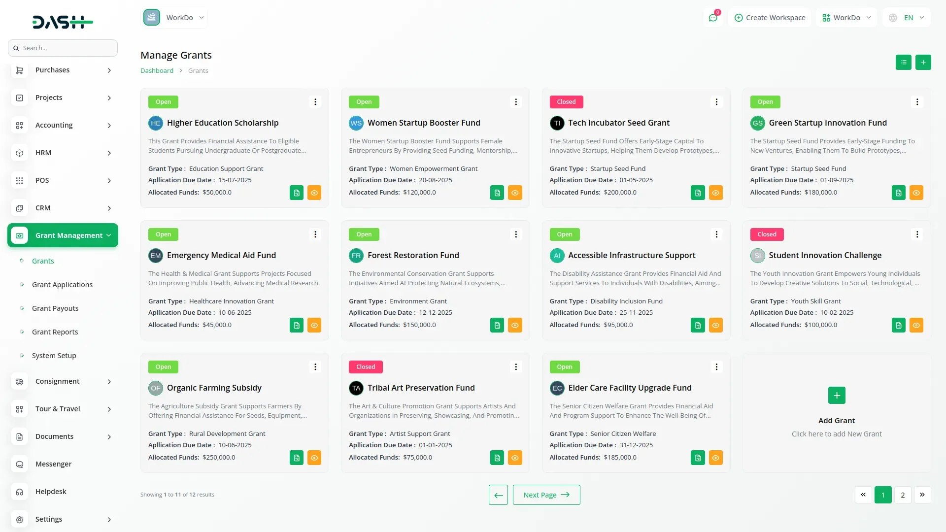 The Grant Management – Dash SaaS Add-On is a powerful solution designed to help nonprofits, educational institutions, and research organizations manage the entire grant lifecycle. Key features include application tracking, proposal submission, fund disbursement, reporting, compliance monitoring, and donor communication. Seamlessly integrated with Dash SaaS, this add-on simplifies complex grant processes, enhances transparency, and ensures timely and accurate fund utilization.