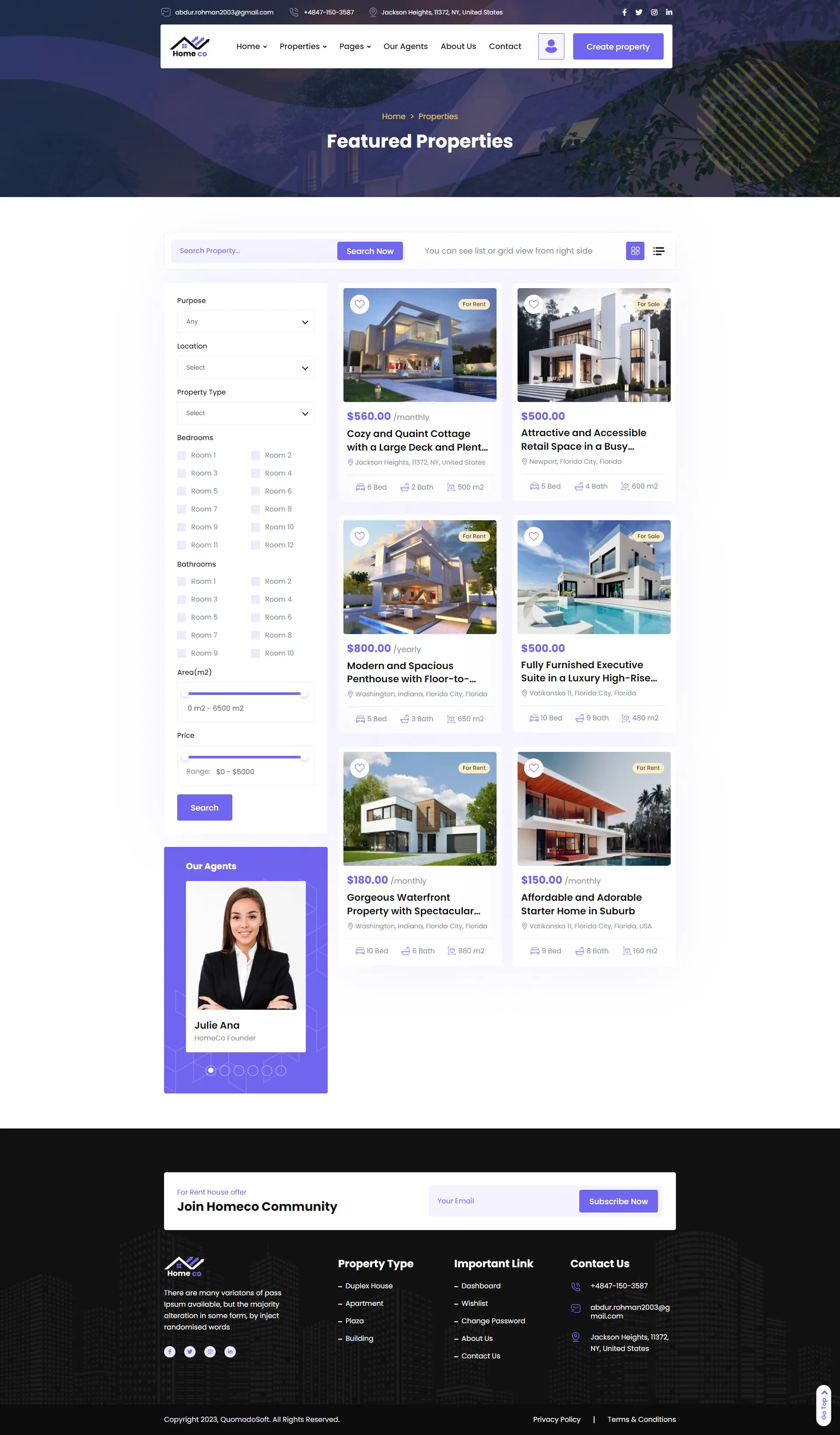 Homeco is a powerful real estate directory listing Laravel script to manage property listings, agents, and inquiries. Features include advanced search, SEO optimization, responsive design, and secure property management tools.