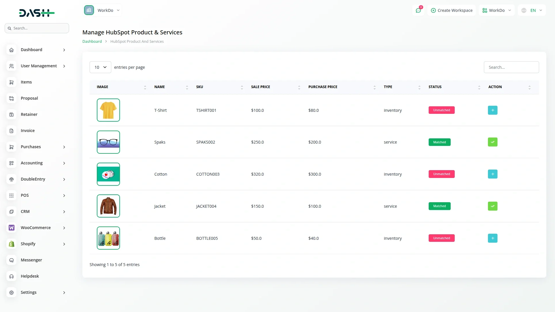 With the HubSpot Add-On, manage all HubSpot products directly from the Items section. After integration, a HubSpot button appears under Items, displaying your all product list with details like name, SKU, image, pricing, type, and status. Use the Create button to add new items by entering product info (name, category, tax, quantity, warehouse). You can also edit or delete any item as needed from the Items menu, and use the sync button to make sure any changes are reflected in the system.