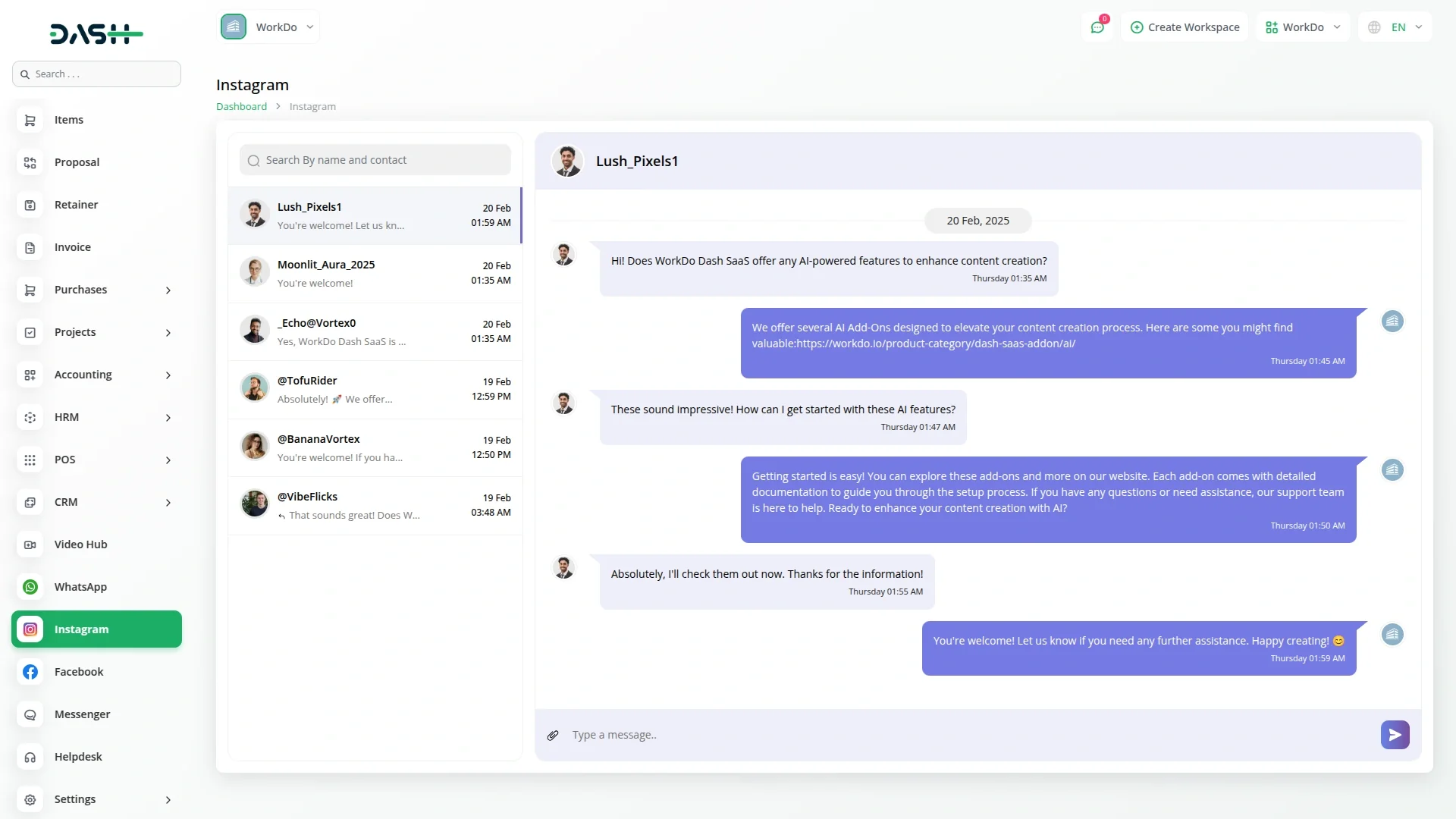 The Instagram Chat – Dash SaaS Add-On empowers businesses to manage and automate Instagram direct messages from a single, unified dashboard. Enhance customer engagement with real-time chat, quick replies, and conversation history. This add-on supports lead generation, sales support, and instant response handling, all integrated with your SaaS platform. Optimize your Instagram communication for better conversions and customer satisfaction using AI-powered insights and keyword-based automation.