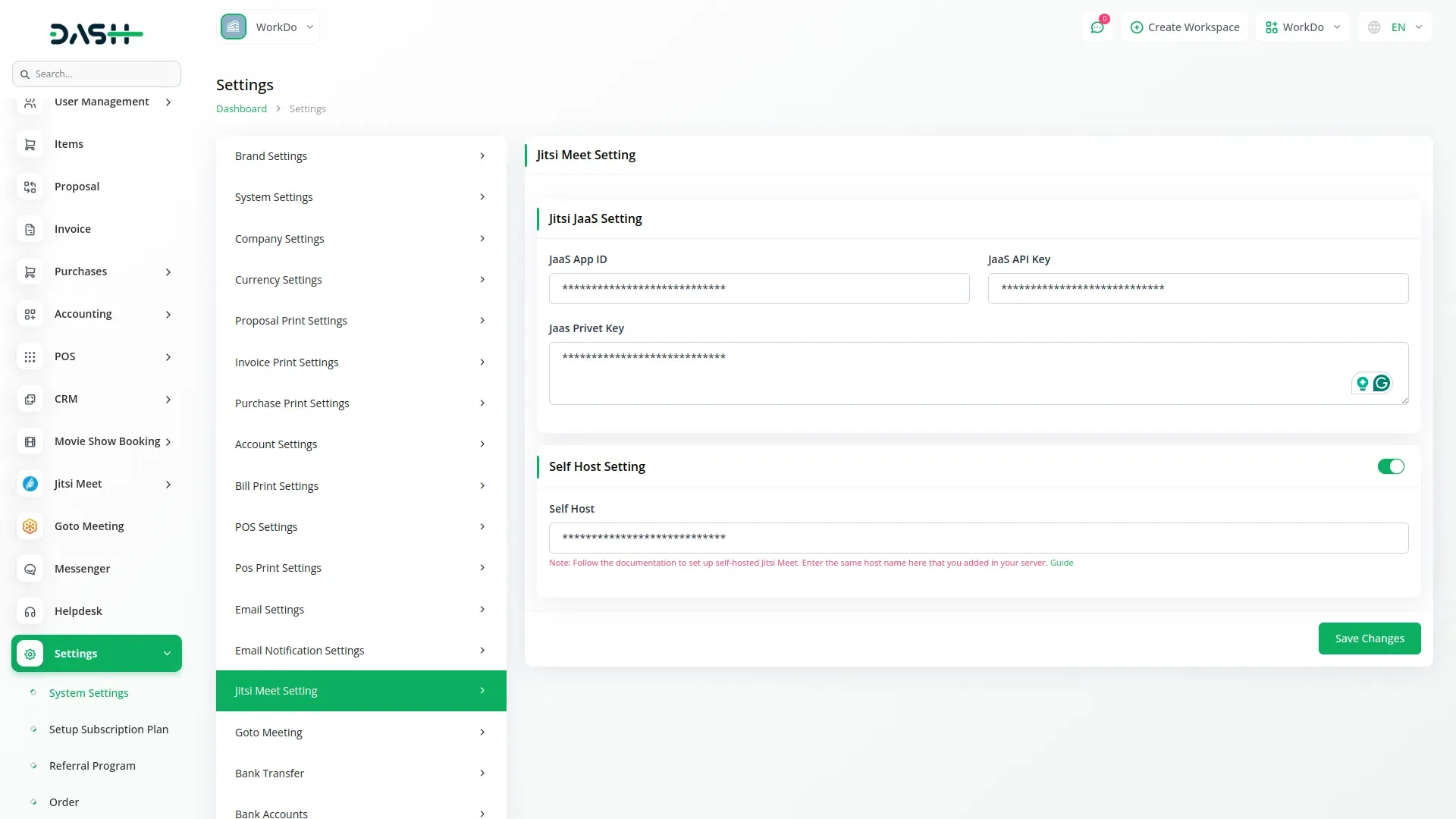 The system settings enable secure Jitsi Meet integration through flexible configuration options, including JaaS and self-hosted setups. For JaaS integration, configure your App ID, API Key, and Private Key for seamless cloud-based authentication. Self-hosted deployment provides complete control with customizable server settings, allowing you to host meetings on your own infrastructure. Enjoy reliable, secure video collaboration tailored to your business.