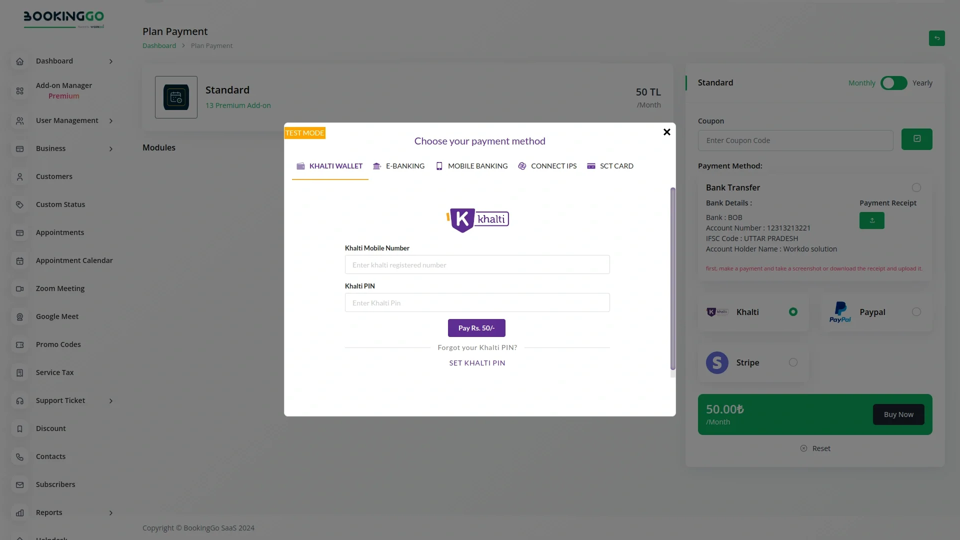 Seamlessly accept payments from your Nepalese customers using Khalti, directly integrated into your BookingGo SaaS platform. This add‑on allows both super admins and company users to configure Khalti credentials (API keys), enable payments for bookings and appointments, and receive funds in NPR (Nepali Rupee). With sandbox and live modes, secure processing, and easy setup, this integration helps reduce friction in payments and improve booking conversion for businesses operating in Nepal.