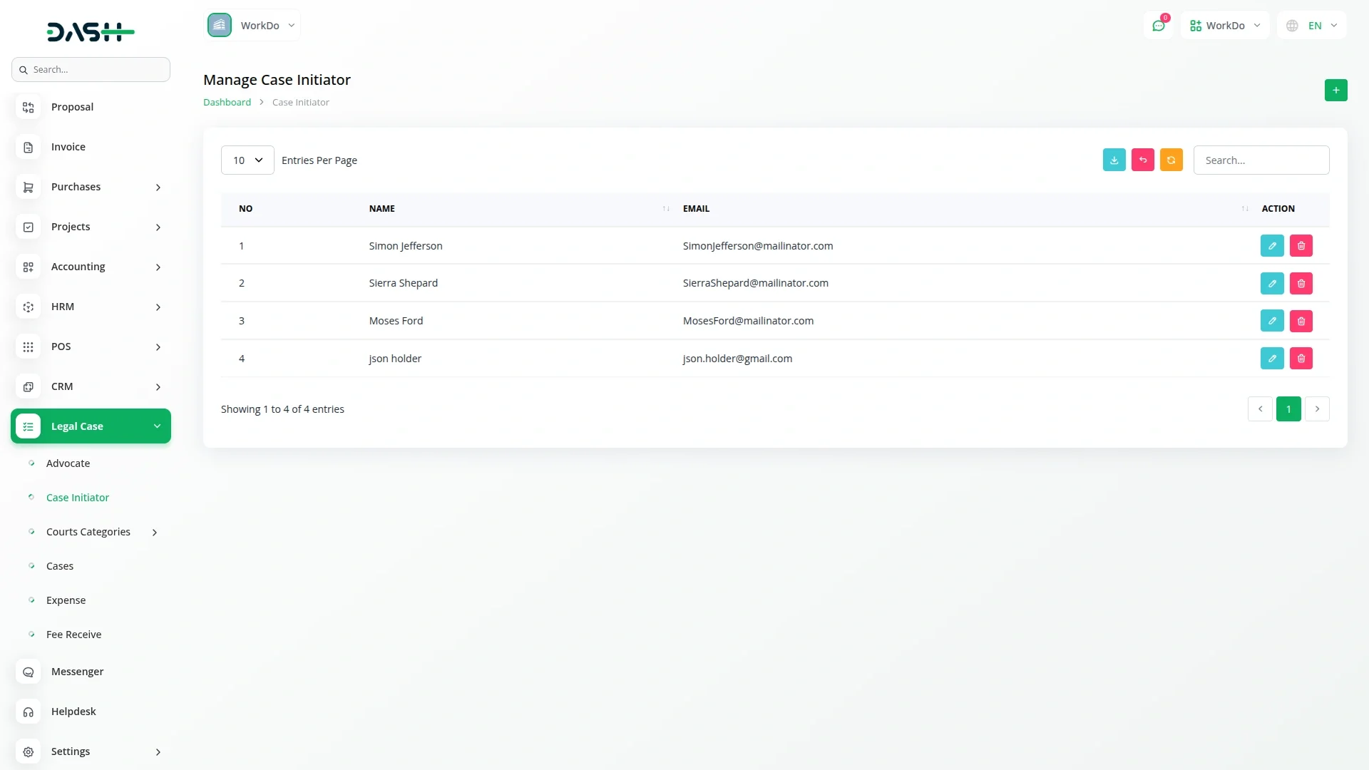 The Legal Case Management Add-On centralizes and simplifies the tracking of legal workflows, including advocate and court hierarchy setup, case management, hearing scheduling, expense tracking, and invoice generation. It provides user-linked advocate profiles, detailed party and legal section records, workspace-based hearing logs, and transparent financial documentation. With structured case tracking and secure user access, it is ideal for legal firms, solo advocates, and judicial teams seeking organized legal operations.