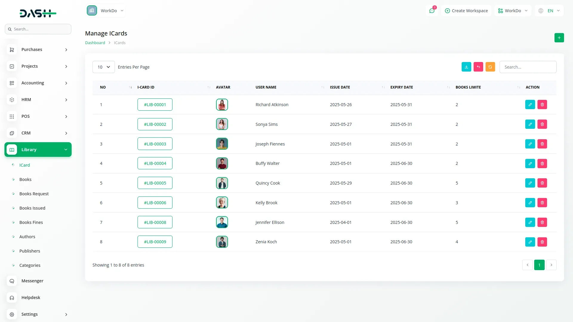 The ID Card system offers a structured approach to managing library users through personalized digital cards. Each card includes essential fields like the associated user, issue date, expiry date, number of books that can be issued, and optional notes. Admins can create, edit, and delete cards directly, helping maintain borrowing limits and organize user access. Cards also visually represent users through avatars, simplifying identity verification and improving user recognition. Every issued book, fine, or request made by the user is linked back to their I-Card profile, ensuring centralized tracking of all activities.