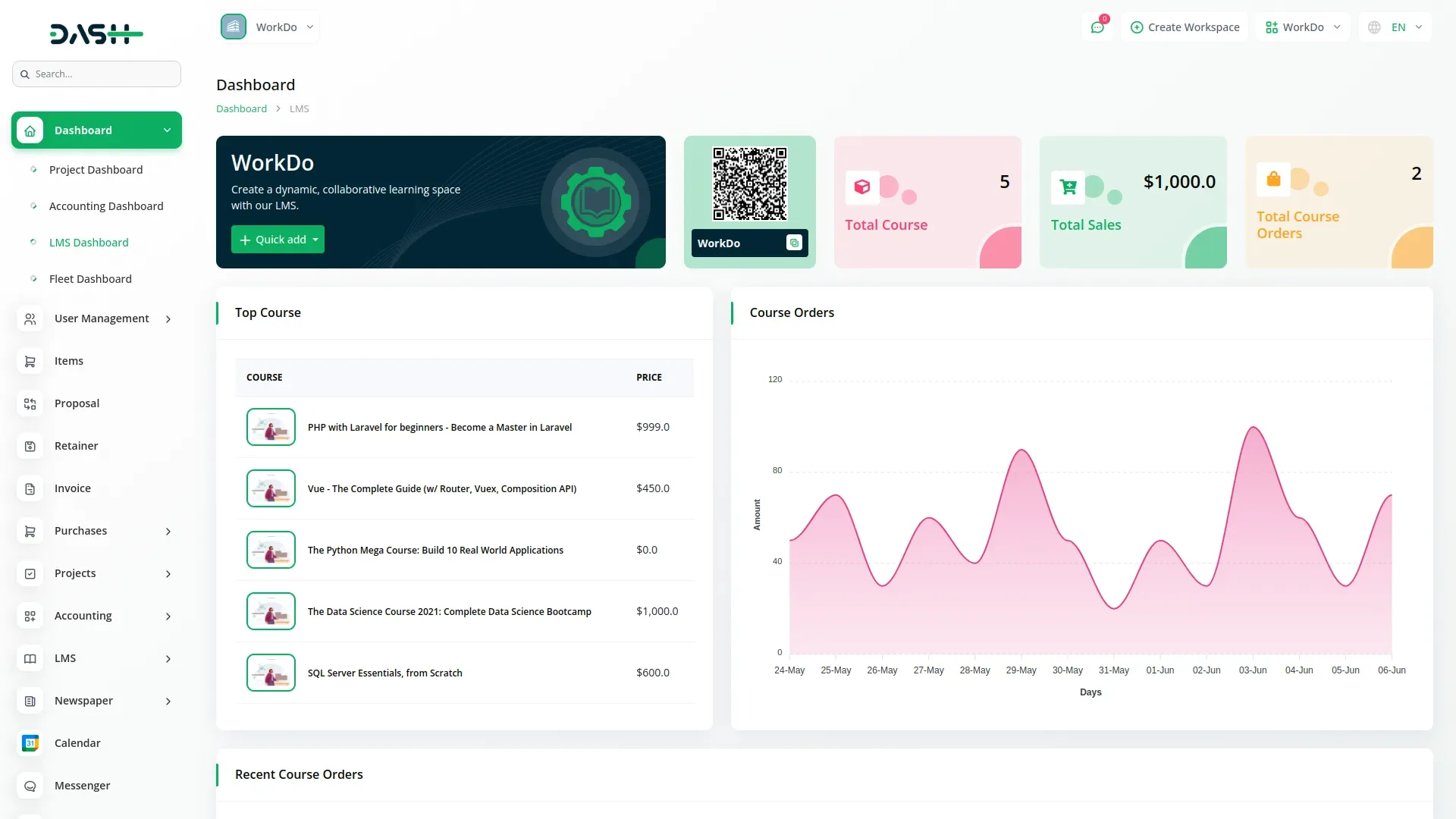 The LMS Dashboard offers a centralized view of sales, orders, and course performance, with widgets for quick actions and analytics. Admins can instantly create content, track top-performing courses, and access a unique QR code and booking link for easy sharing and enrollments.