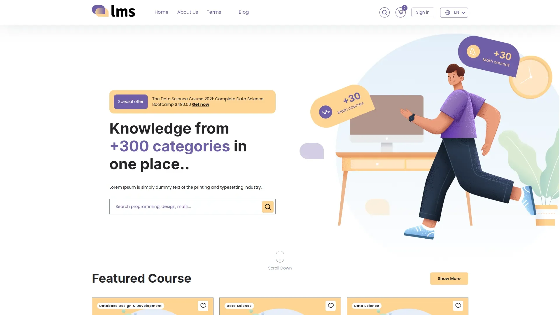 Courses are displayed on the frontend through featured and category-based sections for easy browsing. Each course card includes key details and links to a full course page with syllabus, Tutor, and reviews. Authenticated students can quickly add courses to cart and complete secure checkout.