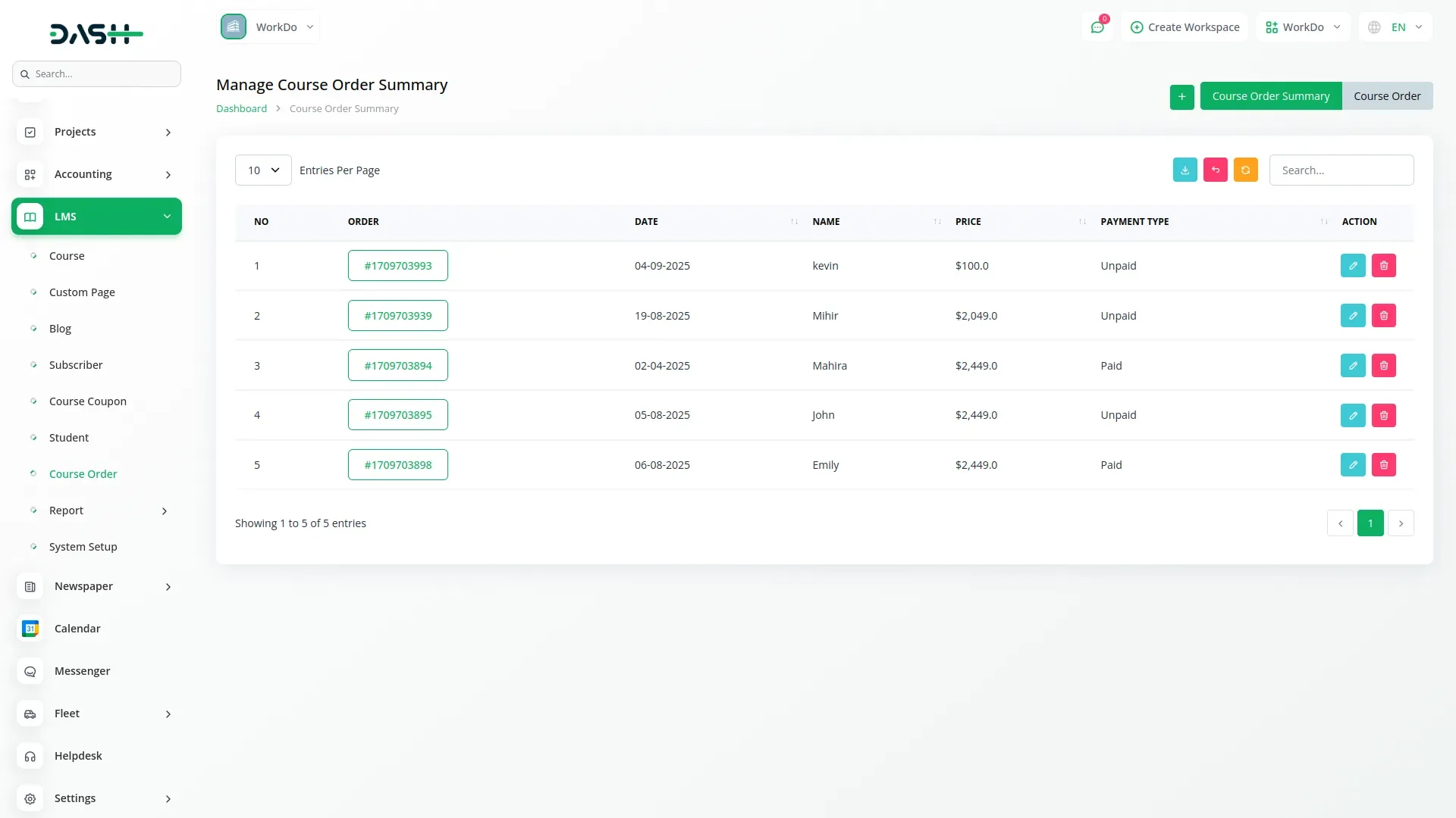 The Course Order section captures all user purchases made via the website, helping analyze sales performance. Course Summary logs manually created backend orders for customized offerings and promotions. Invoices can be generated from the Invoice section using the Order ID for financial tracking and reporting.