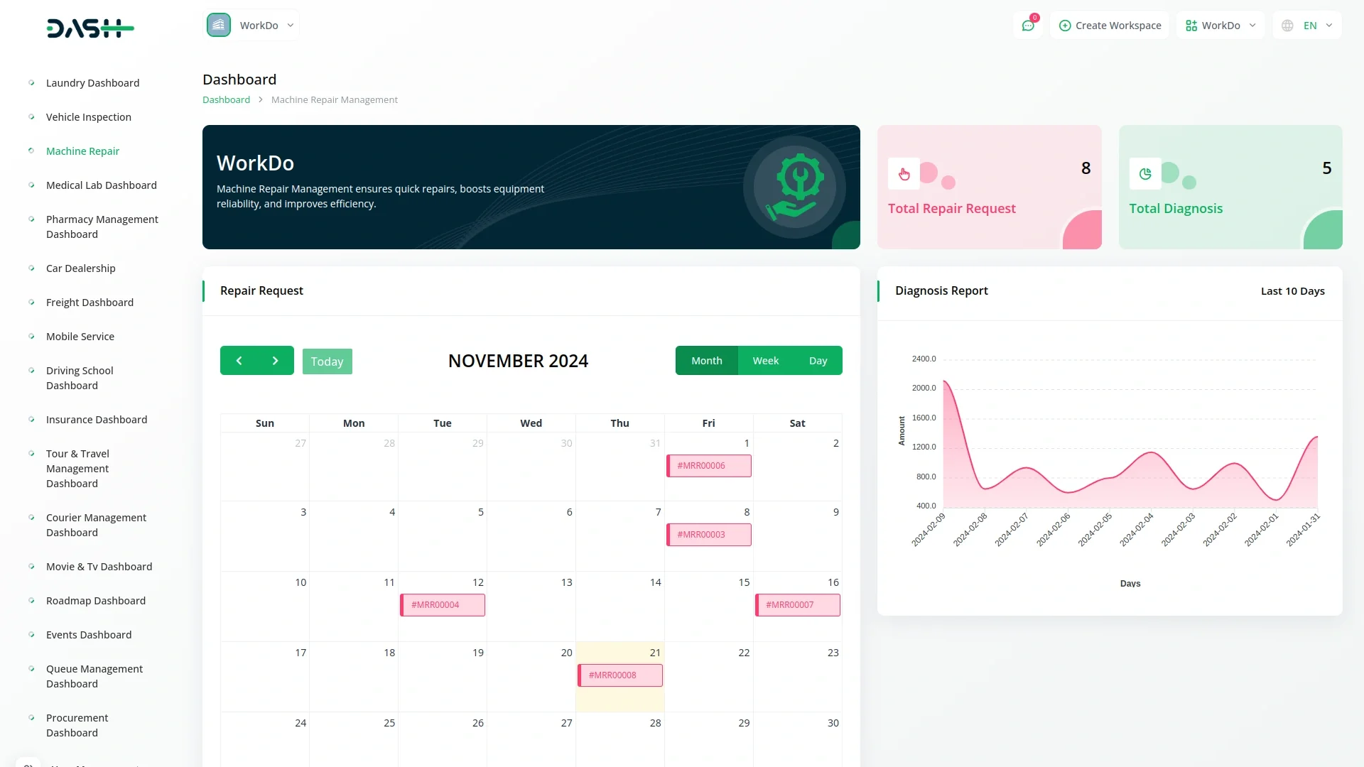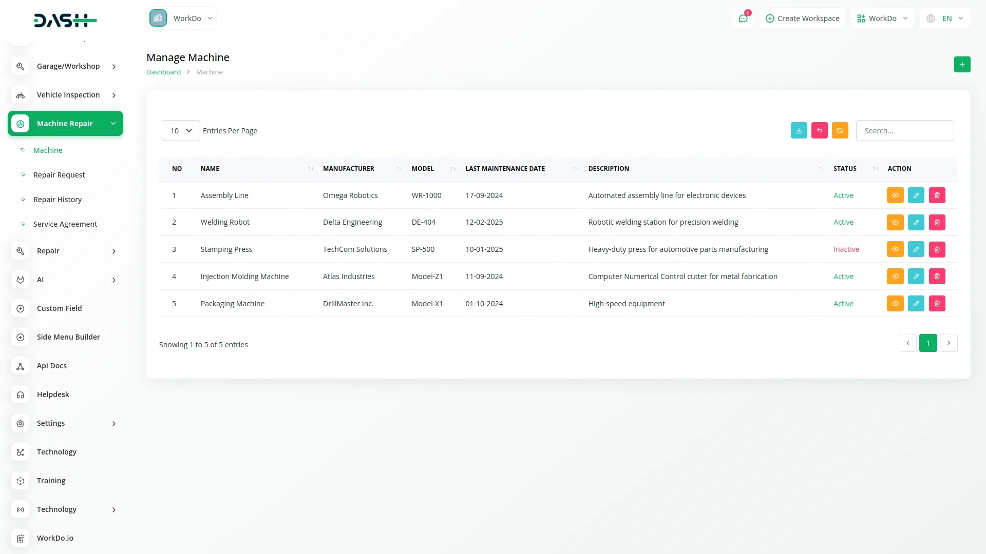 Machine Repair Management – Dash SaaS Add-On.Simplify and automate machinery maintenance with the Machine Repair Management – Dash SaaS Add-On. Ideal for manufacturing units, service centers, and industrial facilities, this tool helps manage repair requests, schedule maintenance, assign technicians, track machine history, and monitor repair status—all in one platform. Fully integrated with Dash SaaS, this machine repair management system boosts operational efficiency, reduces downtime, and ensures timely equipment servicing.