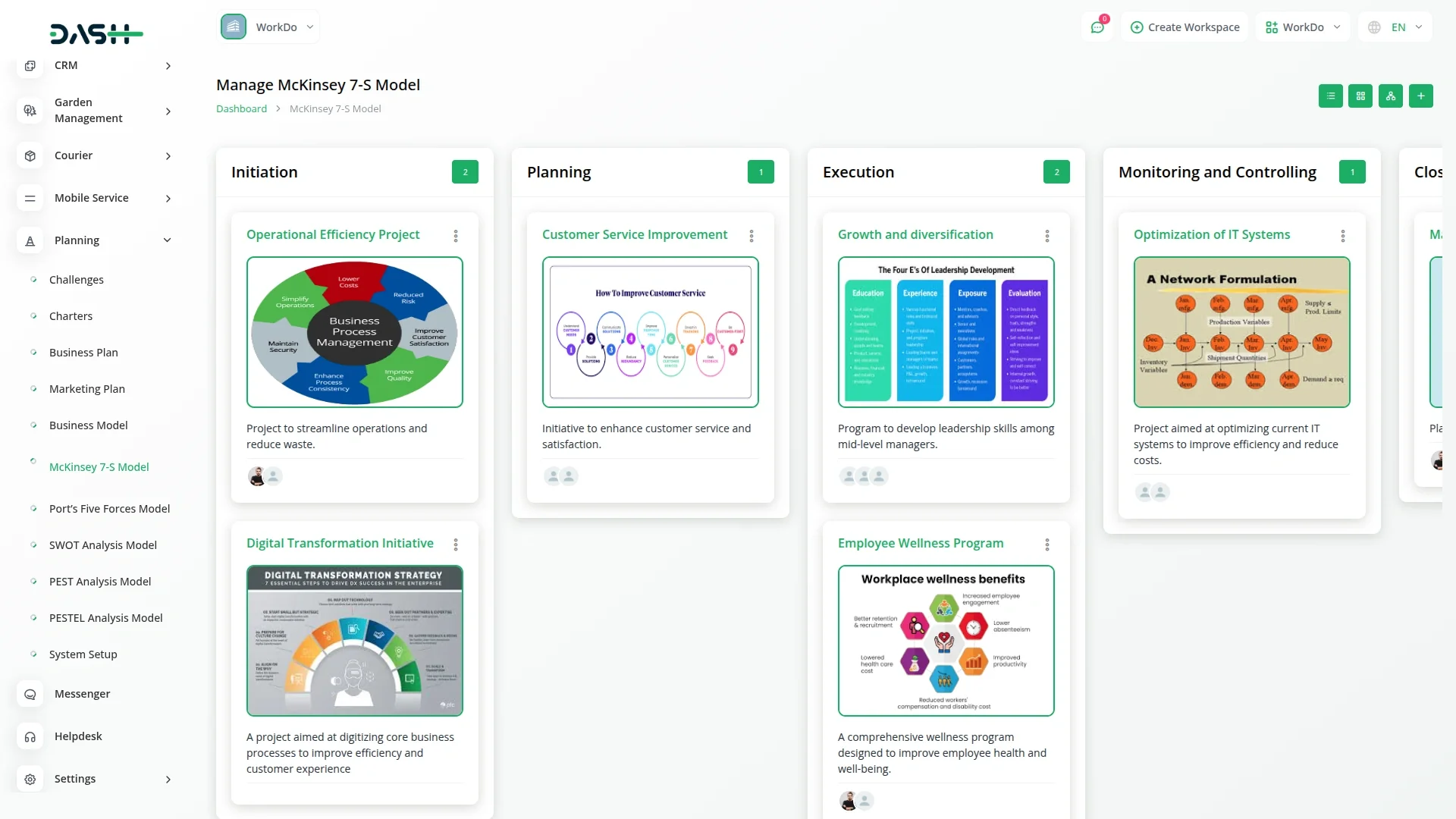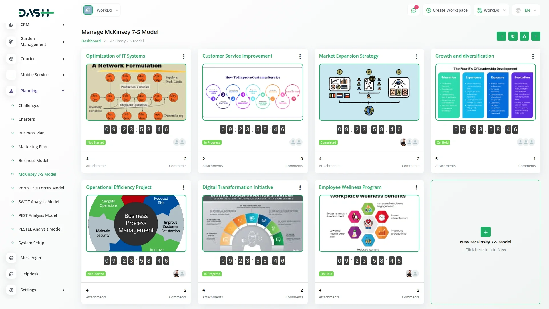 Get a clear and organized view of all your McKinsey 7-S models in an intuitive grid layout. Instantly access key details like assigned users, total comments, attachments, and challenge deadlines with real-time countdowns. This snapshot-style overview makes it easy to monitor progress, collaborate efficiently, and keep your strategic initiatives aligned and on track.