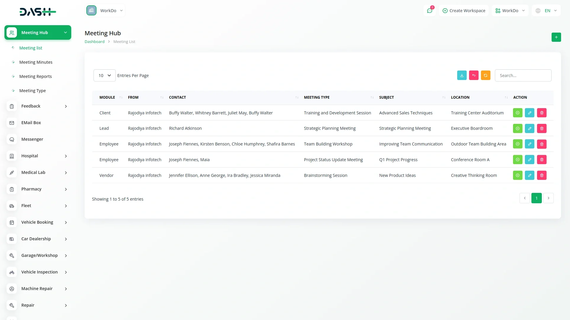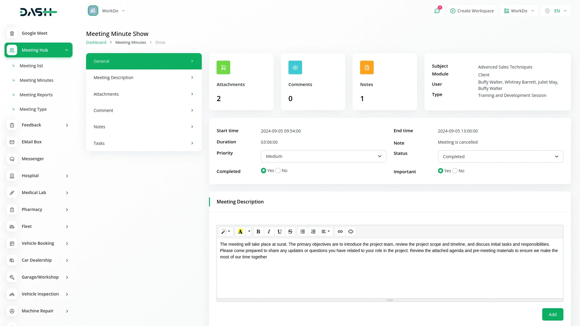 Welcome to the Dash SaaS Meeting Hub Module! Our platform empowers you to efficiently manage all aspects of your meetings, including minutes, lists, reports, and types. With intuitive features and seamless integration, you can enhance collaboration and productivity within your organization.