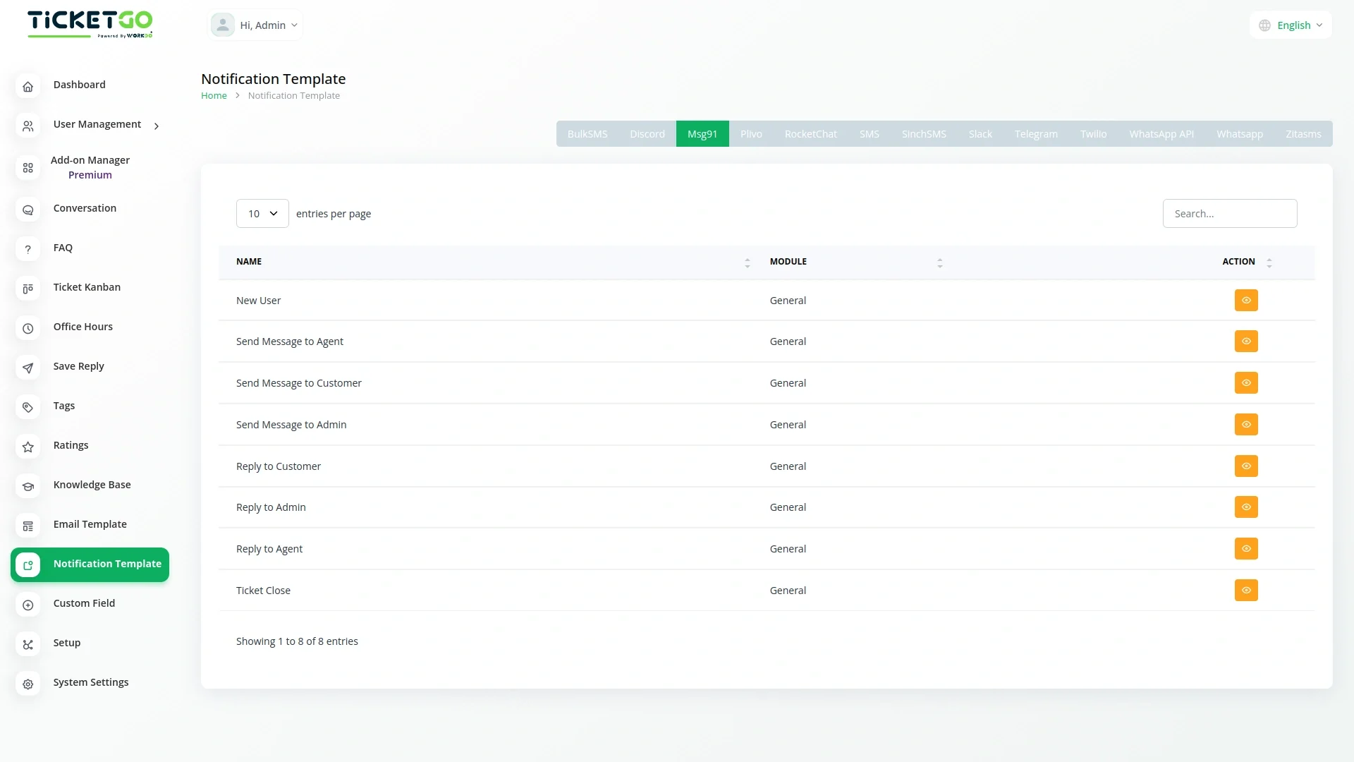 The MSG91 integration in TicketGo enables businesses to automate SMS notifications for various ticketing events, ensuring that all stakeholders—including customers, agents, and admins—receive timely updates. With this integration, businesses can enhance customer support efficiency, improve communication flow, and keep everyone informed in real time. By leveraging MSG91’s powerful messaging platform, TicketGo users can streamline their processes and offer superior customer service through SMS alerts, reducing response times and improving overall ticket management.