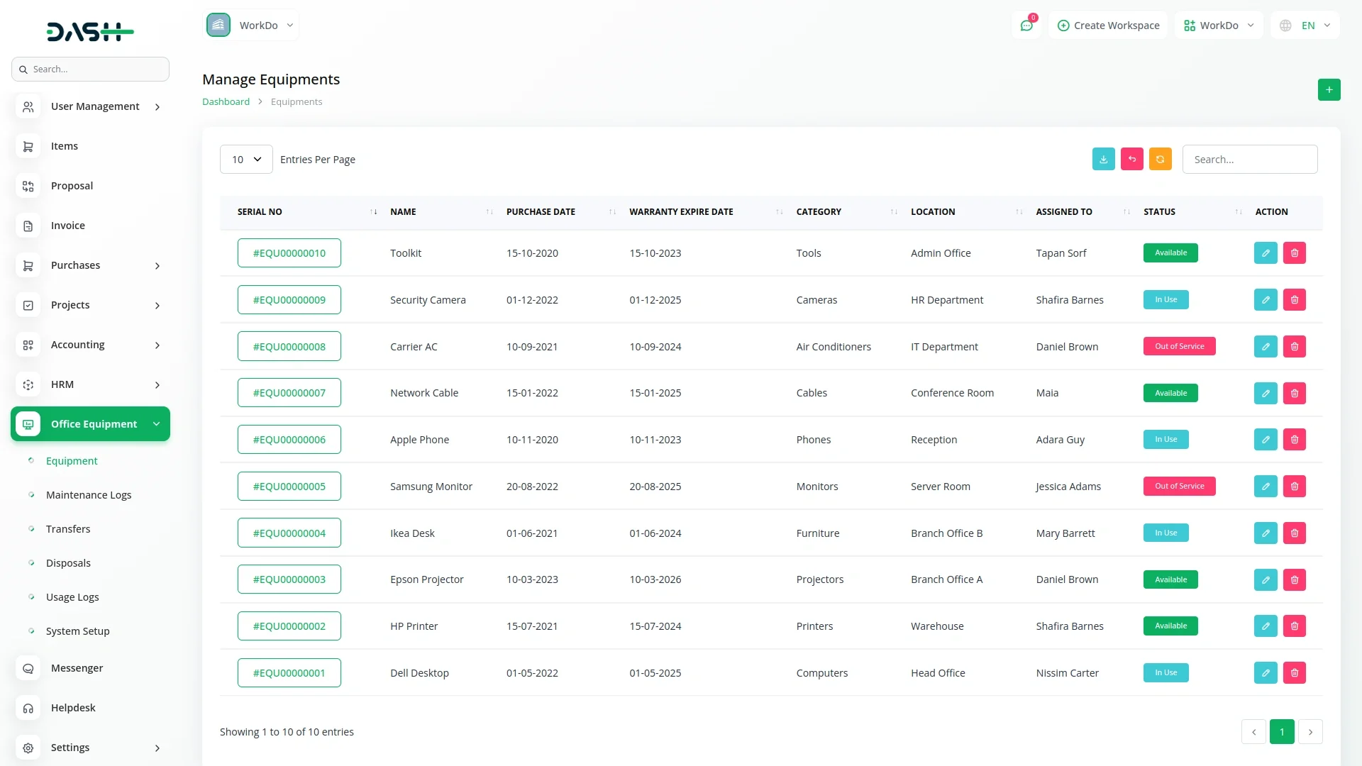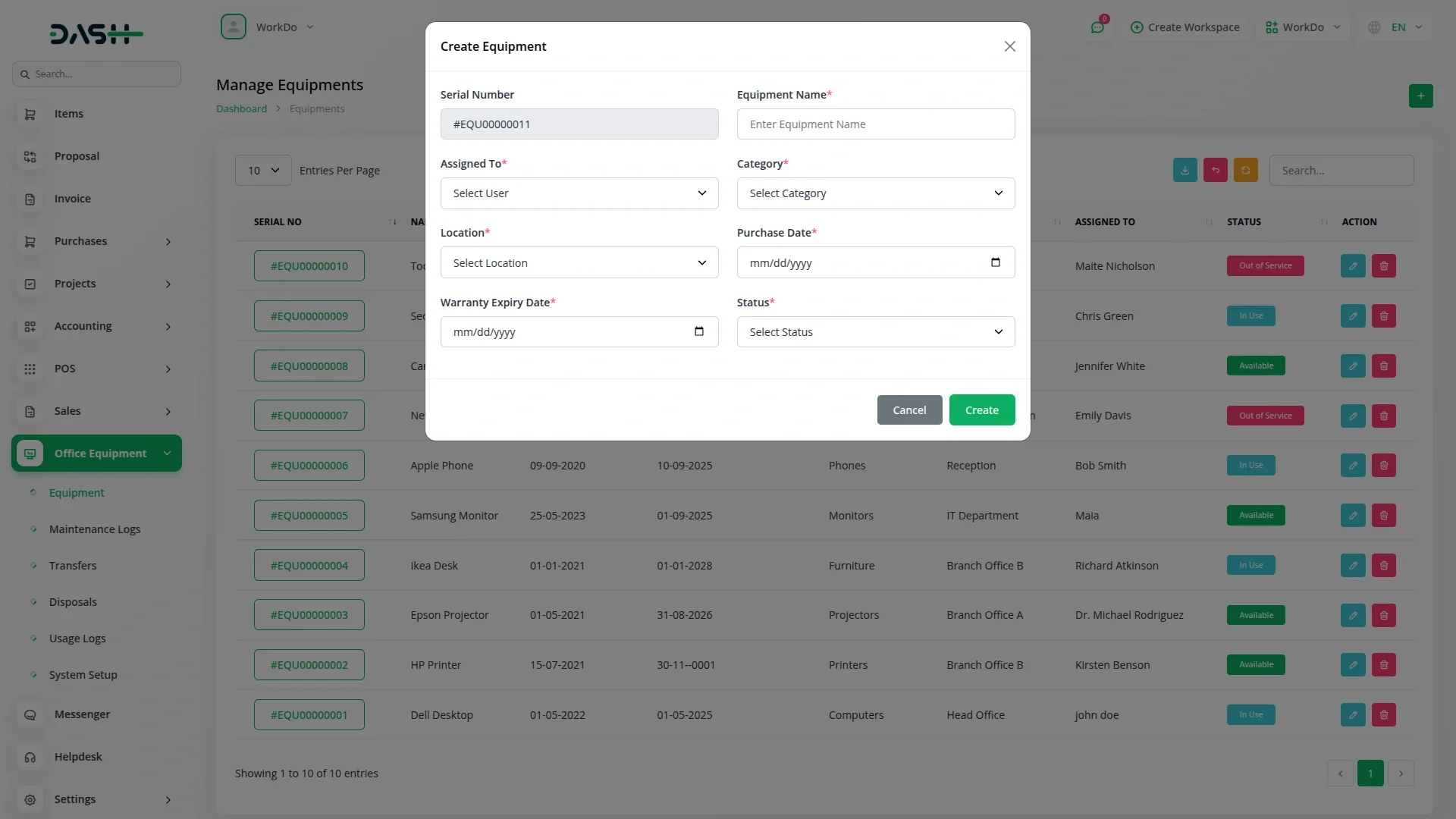 The Office Equipment Management Add-On lets you quickly add new items with all essential details like name, assigned person, category, location, purchase date, warranty expiry, and current status. This ensures everything is organized right from the beginning.