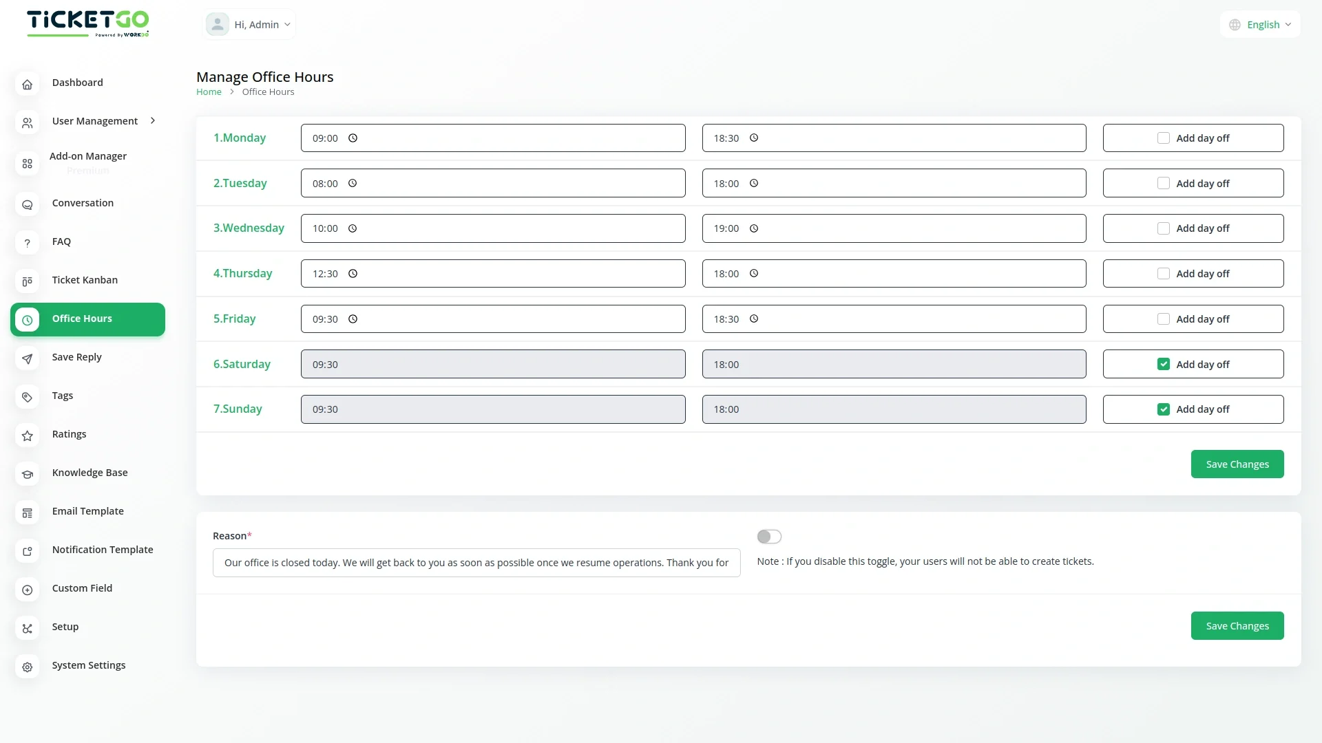 The Office Hours Module in TicketGo allows businesses to set their working hours for each day of the week. This helps customers know when your support team is available. By defining your office hours, you ensure that customers are aware of your business’s availability before they create a support ticket.