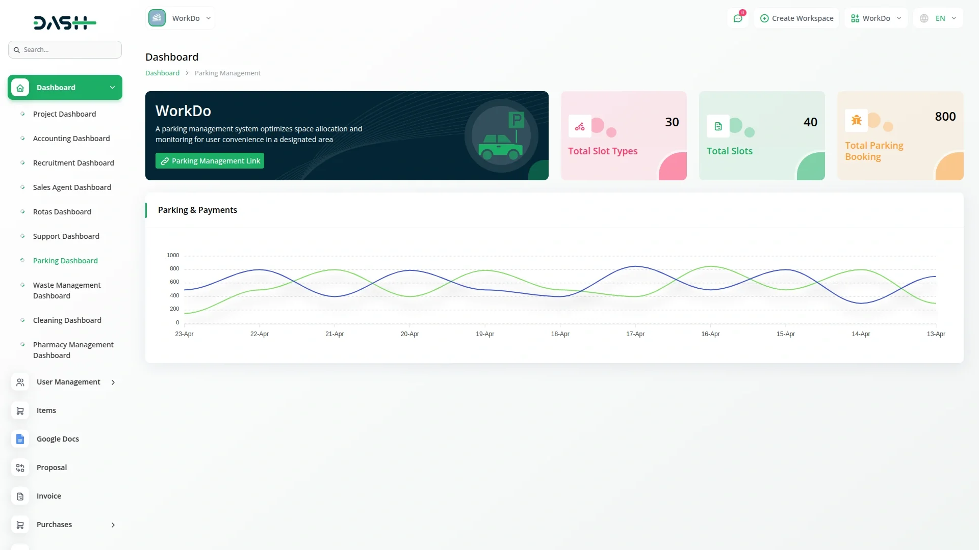 Parking Management – Dash SaaS Add-On is a smart and scalable solution designed to manage parking operations for commercial lots, residential complexes, corporate campuses, and public facilities. This add-on enables digital slot booking, real-time availability tracking, automated ticketing, payment integration, access control, and detailed reporting. It enhances efficiency, reduces congestion, and improves the parking experience for both operators and users—all seamlessly managed within the Dash SaaS platform.