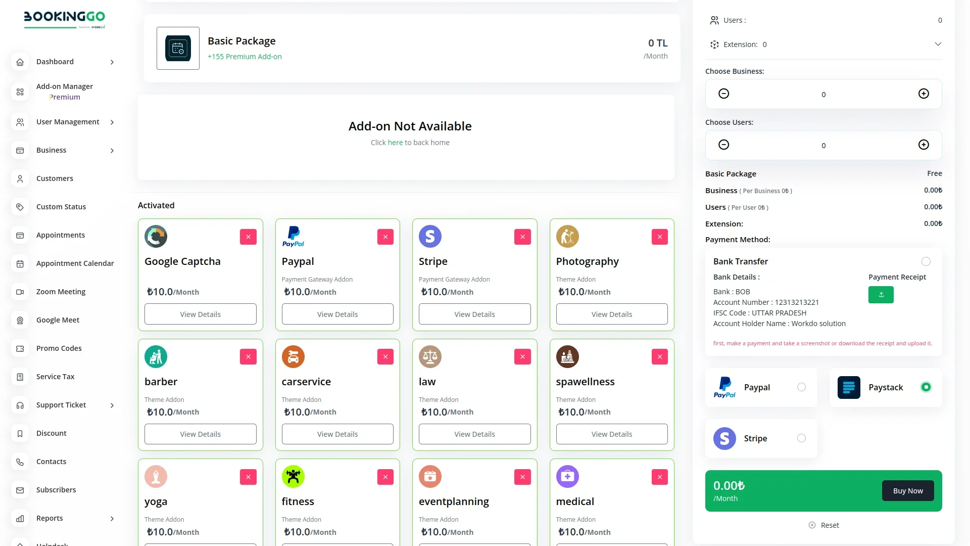 The Paystack Add-On for BookingGo SaaS allows businesses to accept secure online payments with ease. With Paystack integration, customers can pay for their bookings using multiple methods, including debit/credit cards, bank transfers, USSD, and mobile money.