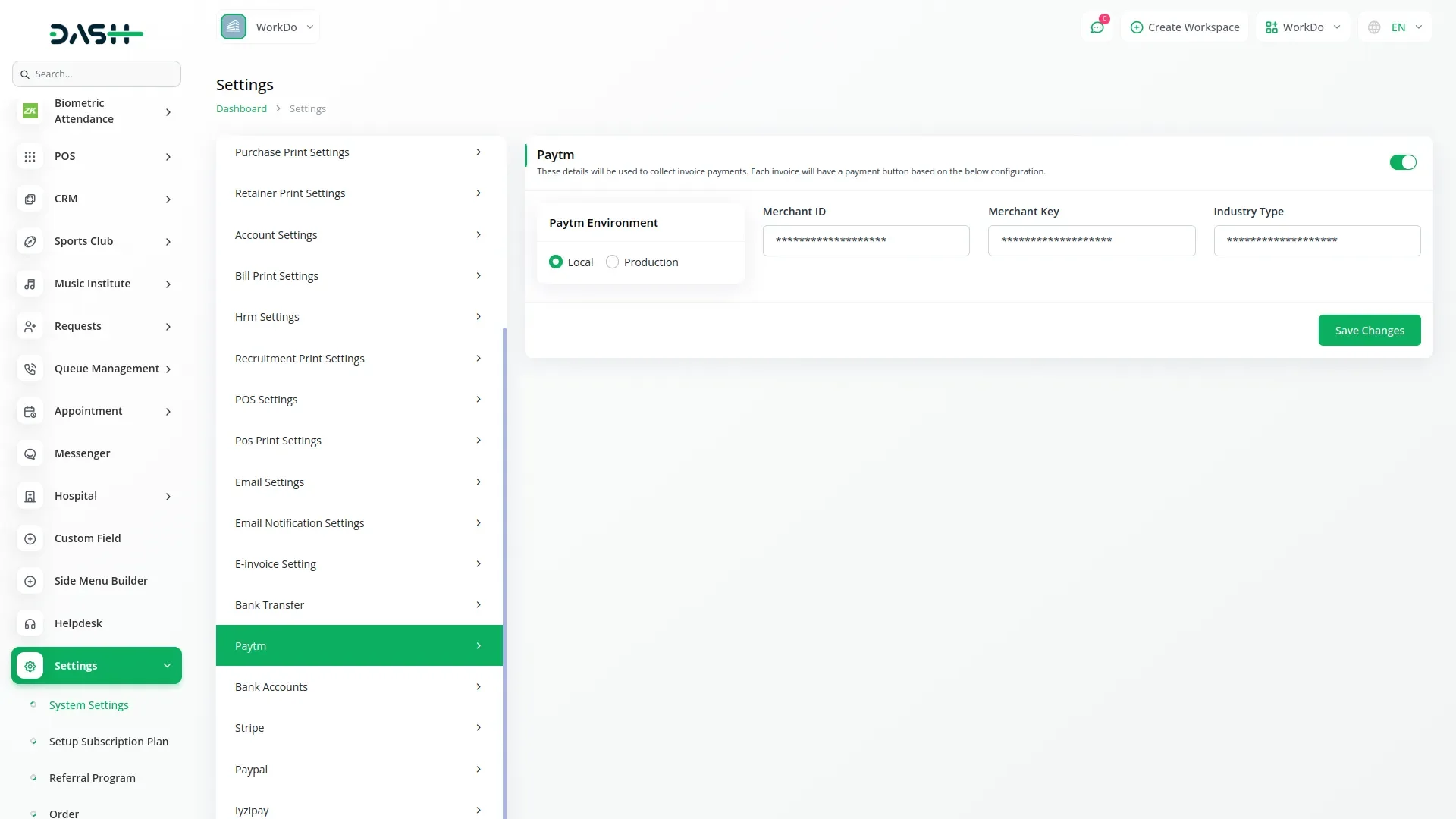 API Key Settings Page for Paytm Integration